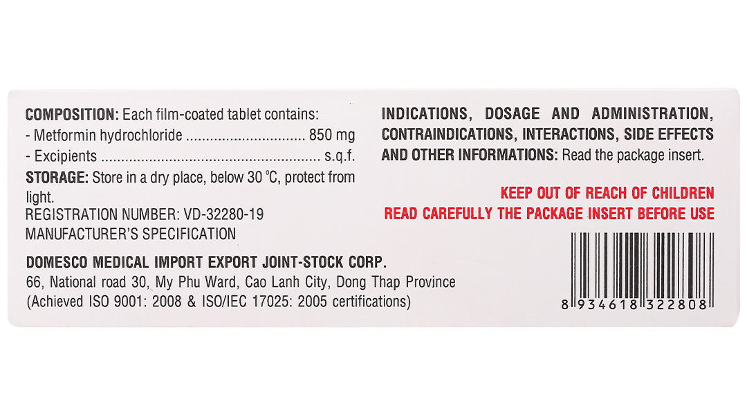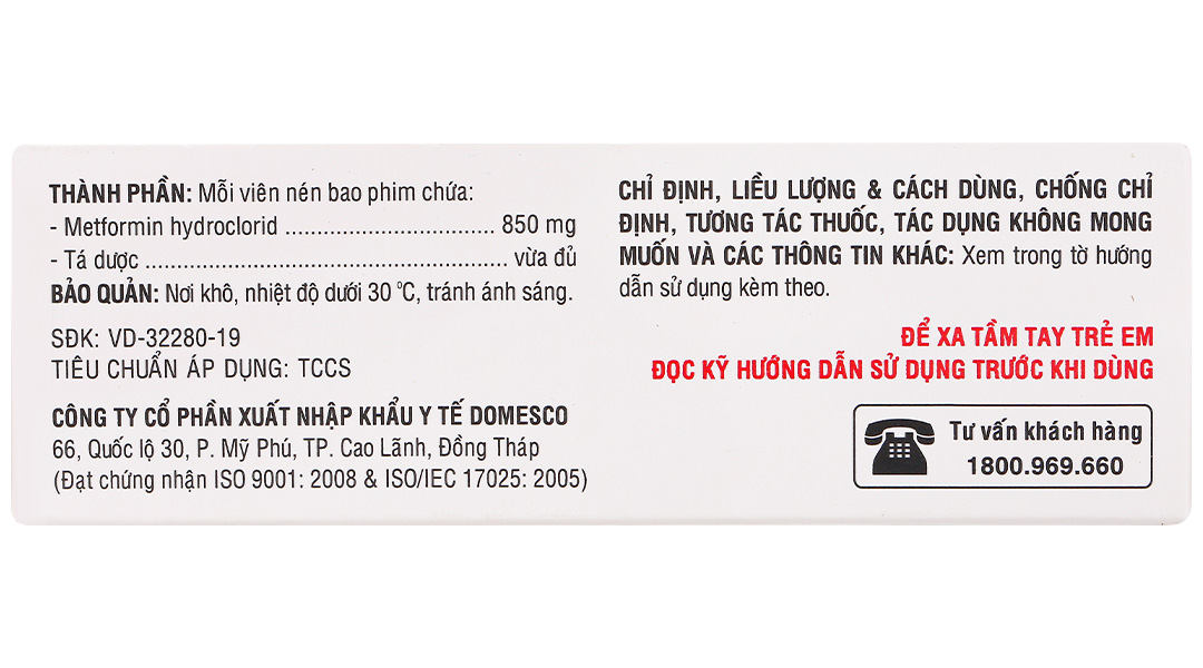 - Thành phần dược chất: Metformin hydrochlorid 850 mg.