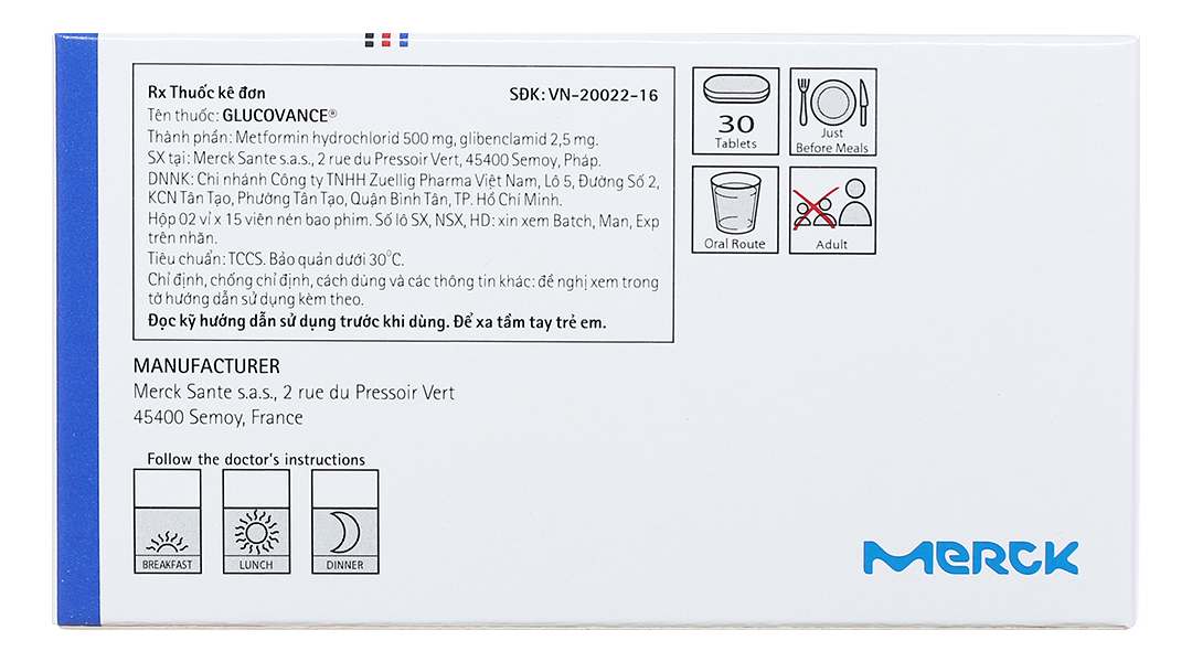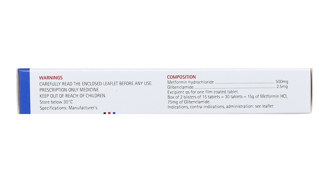 Thành phần hoạt chất: Metformin hydrochlorid 500 mg, Glibenclamid 2.5mg.