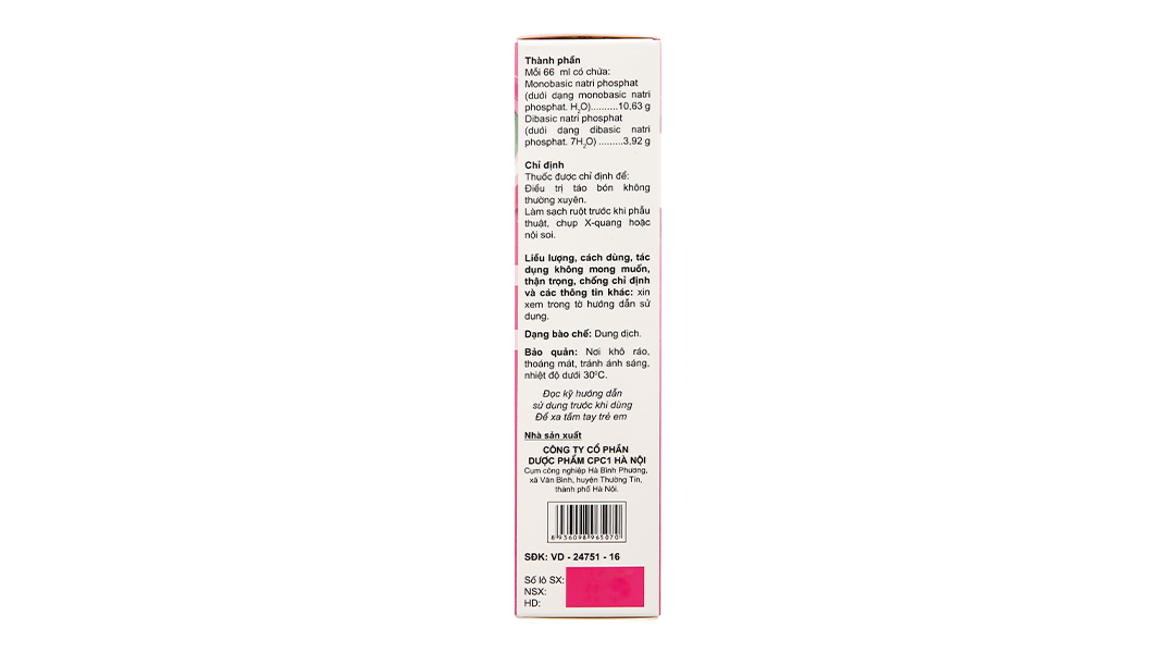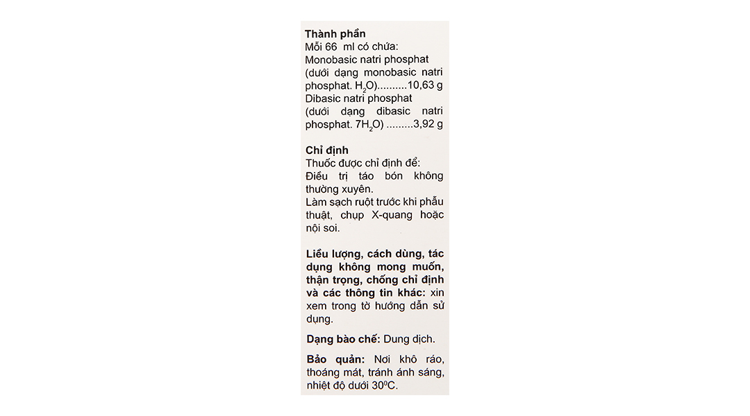 - Dibasic natri phosphat (dưới dạng dibasic natri phosphat.7H2O) 3,92g.
