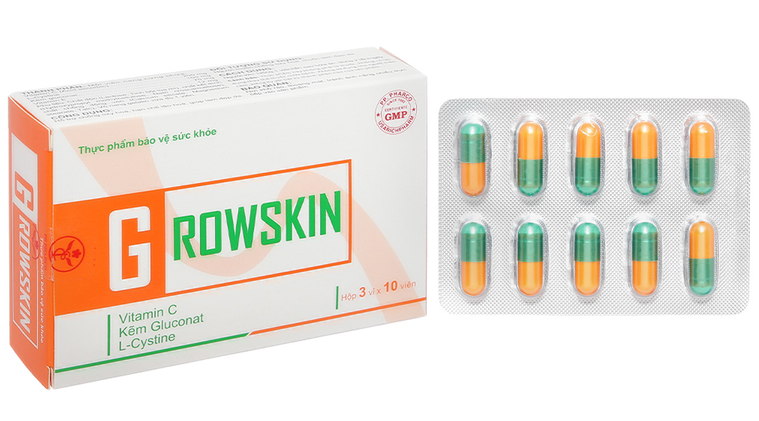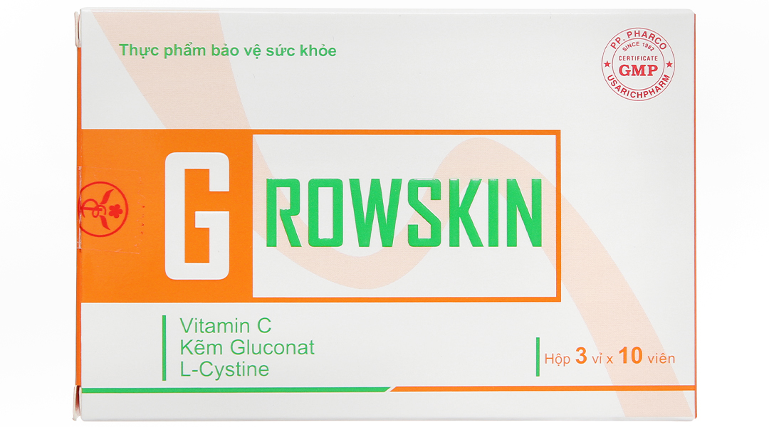 Growskin là sự kết hợp hoàn hảo của các thành phần chống oxy hóa mạnh như: Vitamin C, Vitamin E và các chất như L-Cystine, Kẽm gluconat, giúp cung cấp đầy đủ dưỡng chất thiết yếu cho làn da từ sâu bên trong, hỗ trợ da chống lại sự tấn công của các gốc tự do, giảm thiểu các dấu hiệu lão hóa và làm đẹp da một cách tự nhiên và hiệu quả.