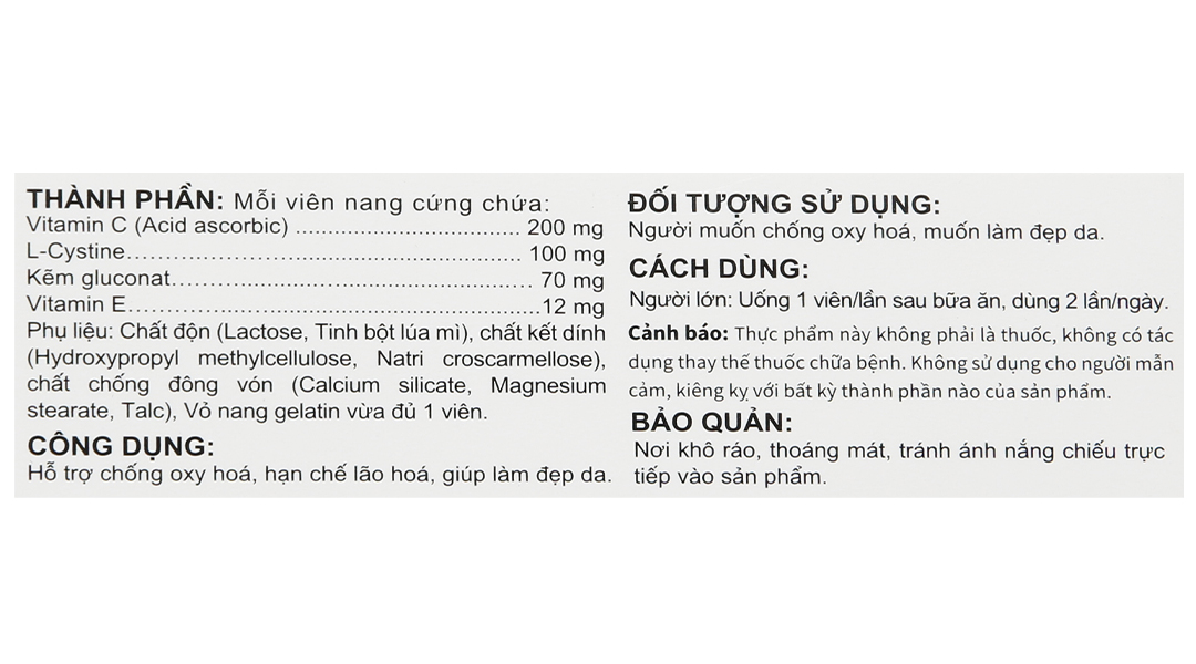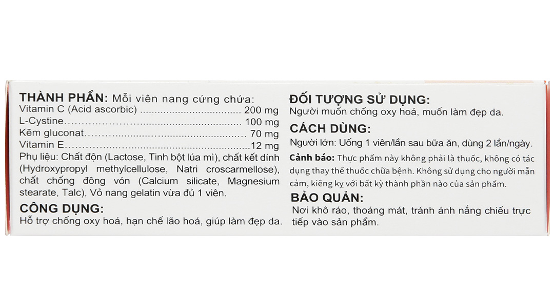 Vitamin C là một thành phần chủ chốt giúp làm sáng da, giảm thâm nám và kích thích sản sinh collagen, giúp da trở nên đàn hồi và mịn màng hơn. Bên cạnh đó, Vitamin E bảo vệ da khỏi các tác hại từ môi trường, tăng cường độ ẩm và nuôi dưỡng da mềm mại, chống lại các dấu hiệu lão hóa sớm. L-Cystine, một axit amin quan trọng, không chỉ giúp tái tạo và phục hồi tế bào da, mà còn giúp cải thiện kết cấu da, giúp da săn chắc và khỏe mạnh. Cuối cùng, Kẽm hỗ trợ làn da trong việc làm lành các tổn thương, giúp da trở nên đều màu và khỏe mạnh hơn.