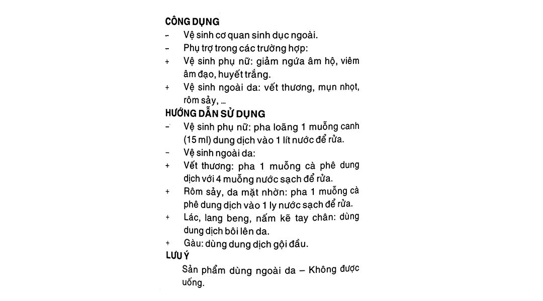 Công dụngVệ sinh cơ quan sinh dục ngoài, giảm ngứa âm hộ, viêm âm đạo, huyết trắng,...