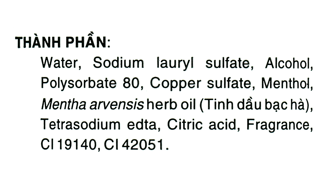 Thành phầnWater, Sodium lauryl sulfate, Alcohol, Polysorbate 80, Copper sulfate, Menthol, Mentha arvensis herb oil (Tinh dầu bạc hà), Tetrasodium edta, Citric acid, Fragrance, CI 19140, CI 42051.