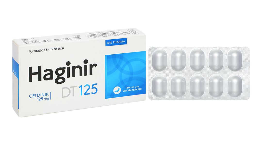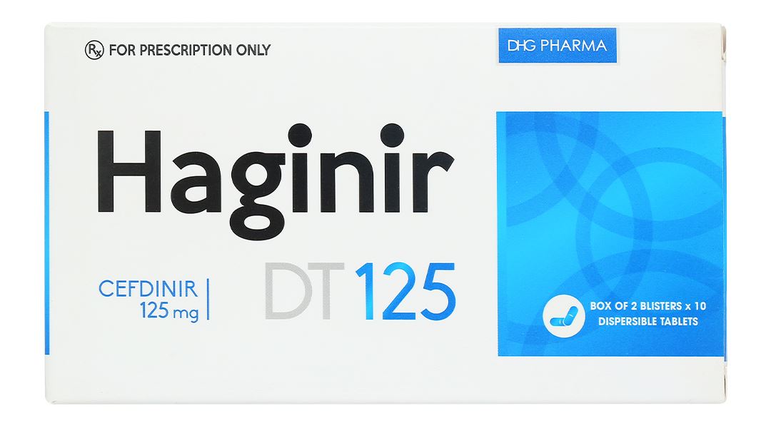 - Haginir DT 125 với thành phần hoạt chất chính là cefdinir, kháng sinh thuộc nhóm cephalosporin thế hệ 3, có tác dụng diệt khuẩn do ức chế tổng hợp vách tế bào vi khuẩn. Các thử nghiệm in vitro và các nghiên cứu lâm sàng cho thấy cefdinir có phổ hoạt tính rộng kháng nhiều vi khuẩn Gram âm như Haemophilus influenza, Haemophilus para influenzae, Moraxella catarrhalis (gồm cả chủng tiết beta – lactamase) và vi khuẩn Gram dương như Staphylococcus aureus (gồm cả chủng tiết beta – lactamase), Streptococcus pneumoniae (chủng nhạy cảm với penicillin), Streptococcus pyogenes. Ngoài ra các kết quả in vitro còn cho thấy cefdinir có hiệu quả kháng một số dòng vi khuẩn Gram âm khác như Citrobacter diversus, Escherichia coli, Klebsiella pneumoniae, Proteus mirabili và Gram dương như Staphylococcus epidermidis (chủng nhạy cảm methicilin), Streptococcus agalactiae, Streptococci nhóm Viridans. Cefdinir không bị ảnh hưởng bởi một số loại men beta – lactamase, đặc biệt có hiệu quả tốt trên các loại vi khuẩn Gram dương như Staphylococcus sp., Streptococcus sp., kháng với những kháng sinh thuộc nhóm cephalosporin uống khác có từ trước. Các chủng Enterococci (Enterococcus faecalis), Pseudomonas, Enterobacter và Staphylococci kháng methicillin đều kháng cả cefdinir.