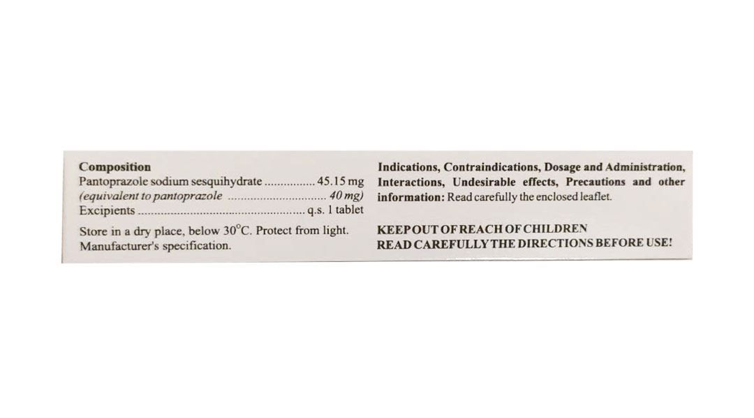 - Hoạt chất: 45,12 mg Pantoprazol natri sesquihydrat (tương đương với 40 mg Pantoprazol).
