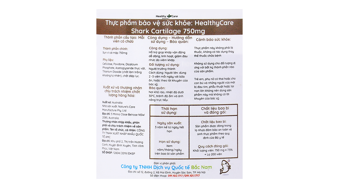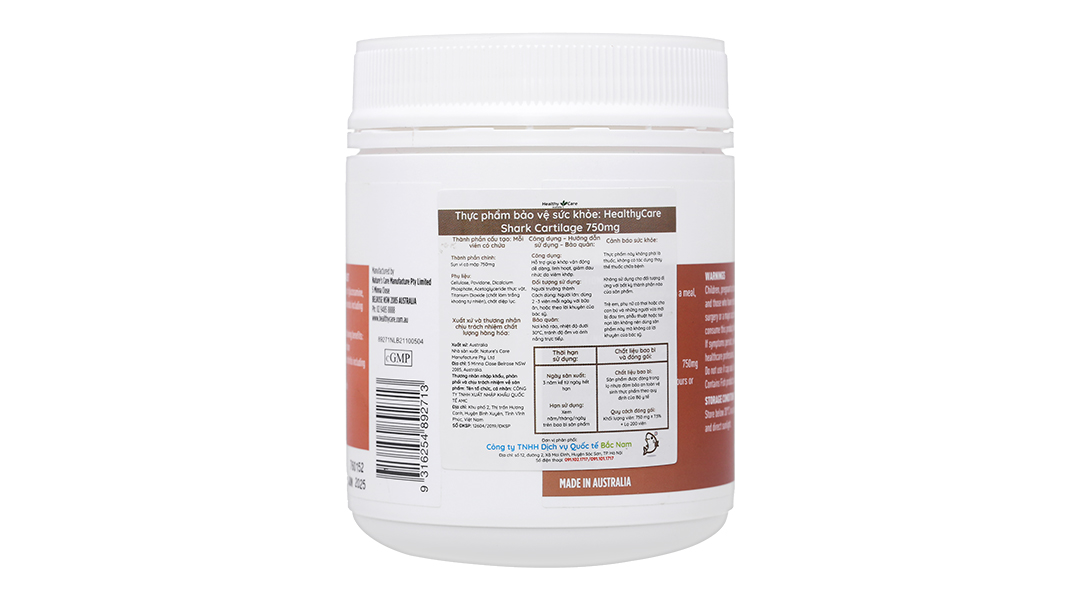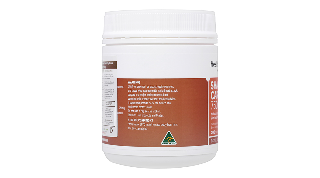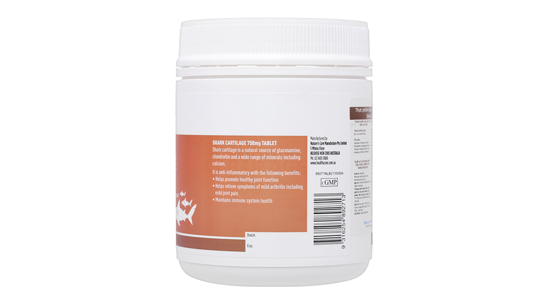Healthy Care Shark Cartilage 750mg với thành phần chính là sụn cá mập – nguồn cung cấp glucosamine, chondroitin tự nhiên và nhiều loại khoáng chất bao gồm canxi. Sản phẩm giúp thúc đẩy chức năng khớp khỏe mạnh, giúp giảm các triệu chứng viêm khớp nhẹ bao gồm đau khớp nhẹ.