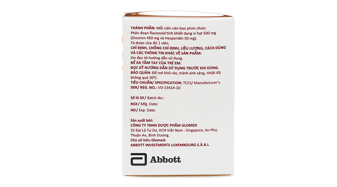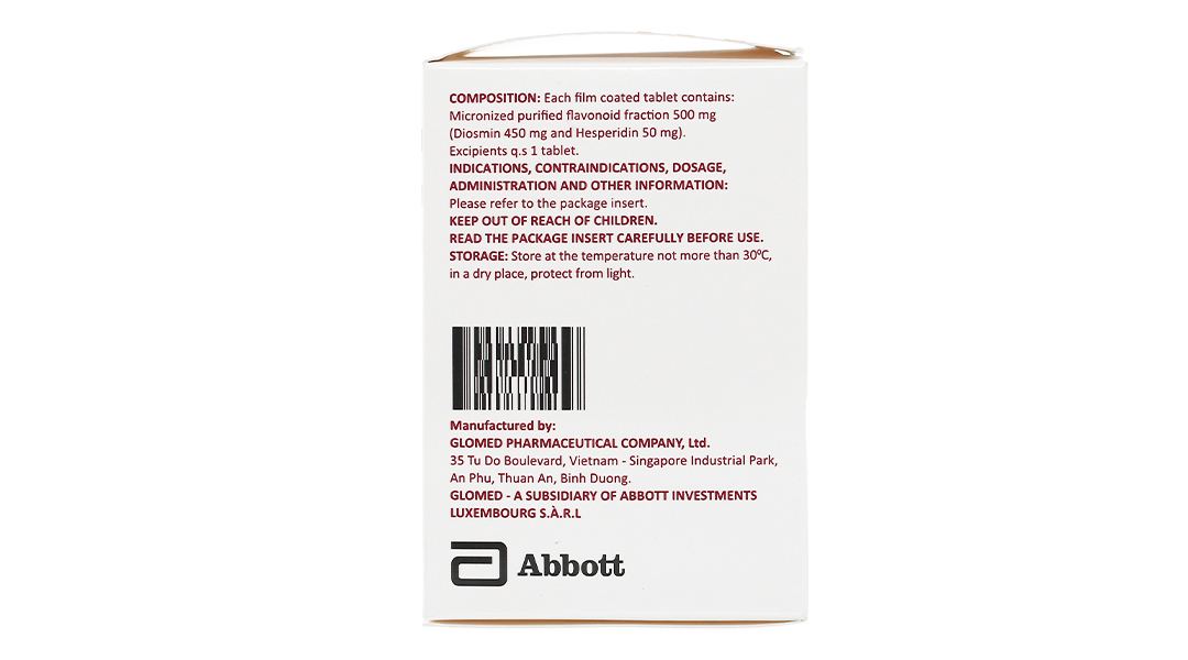 - Hoạt chất: Phân đoạn flavonoid tinh khiết dạng vi hạt 500 mg (diosmin 450 mg và hesperidin 50 mg).
