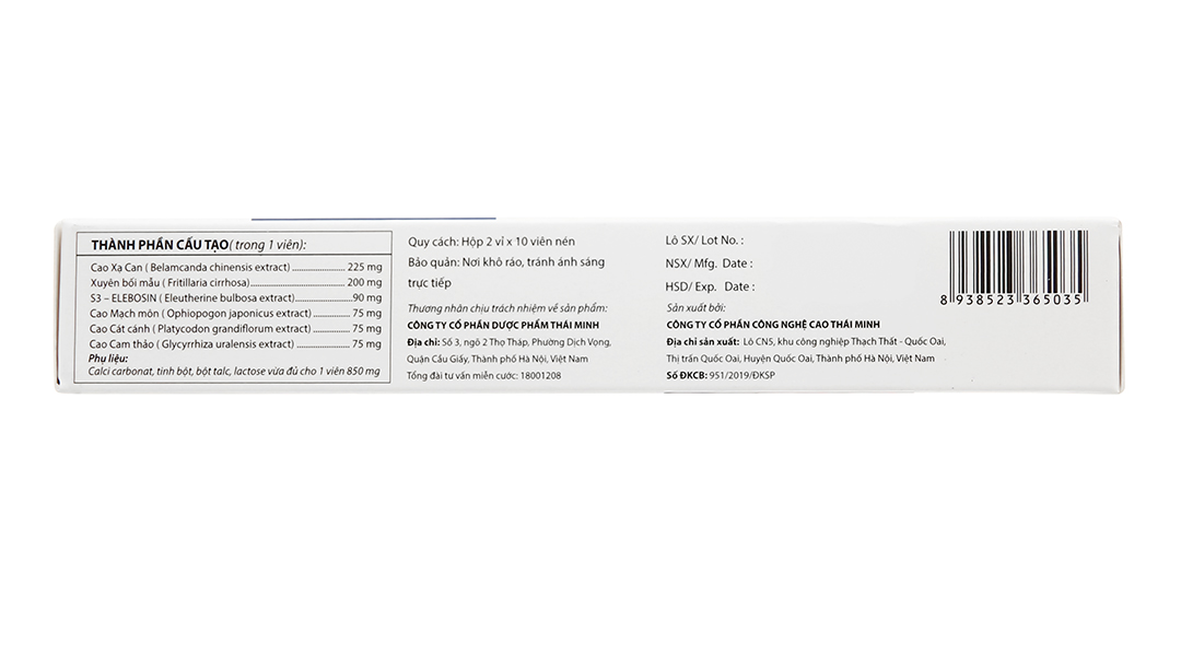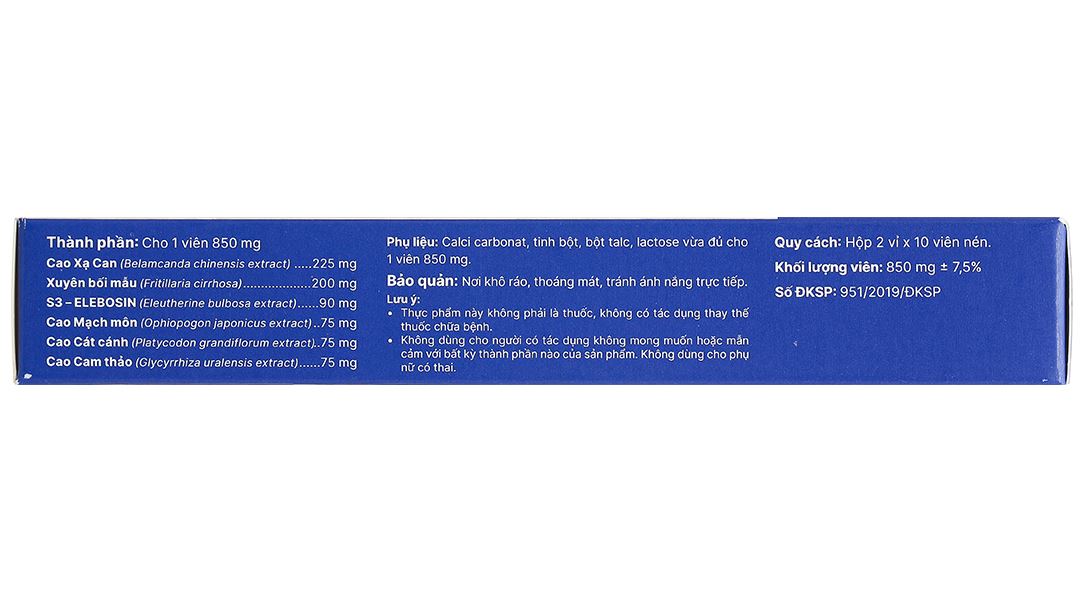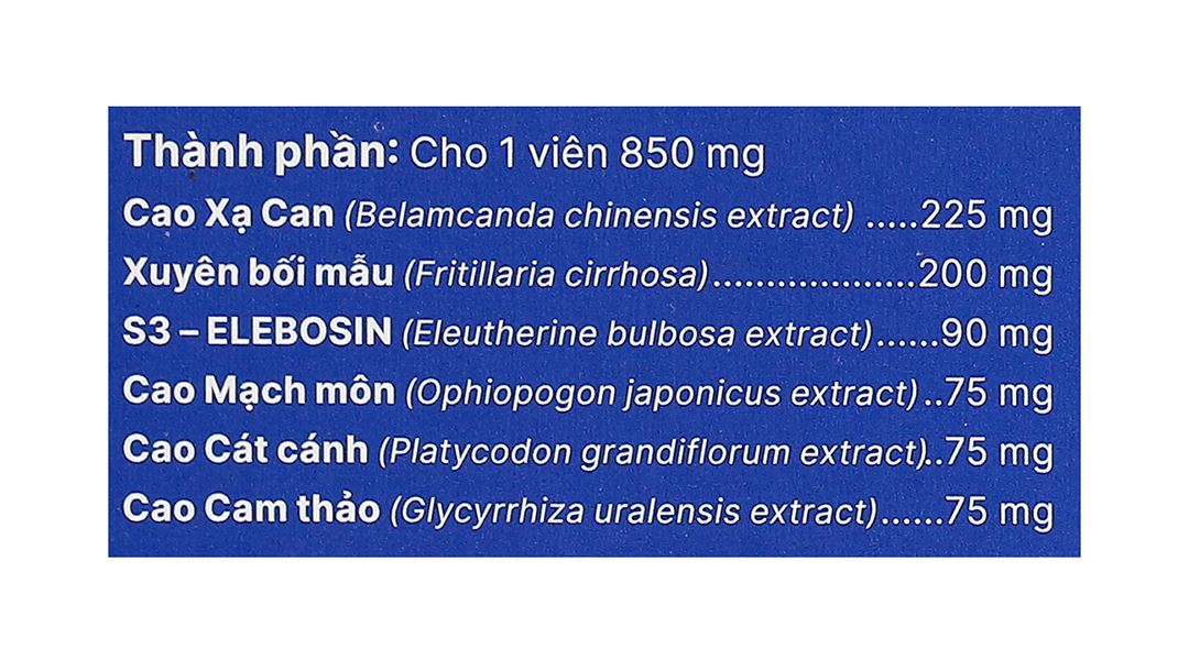 - S3-Elebosin: Dịch chiết của Sâm đại hành, S3-Elebosin có tác dụng kháng khuẩn, chống viêm rất tốt. S3-Elebosin ức chế các chất trung gian gây viêm qua đó giảm các triệu chứng viêm đường hô hấp như sưng đau họng, tiết đờm dịch, ho,…