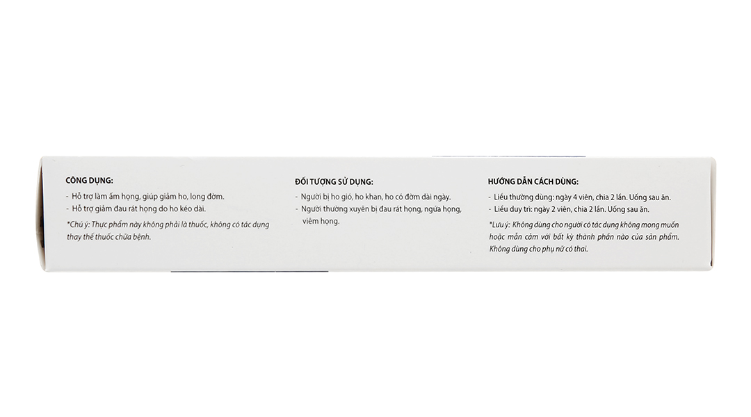 - Người thường xuyên bị ho, đờm, đau rát họng, ngứa họng, viêm họng: ngày dùng 4 viên, chia 2 lần. Uống sau ăn. Nên dùng liên tục từ 2 – 3 tháng để đạt được hiệu quả tốt.