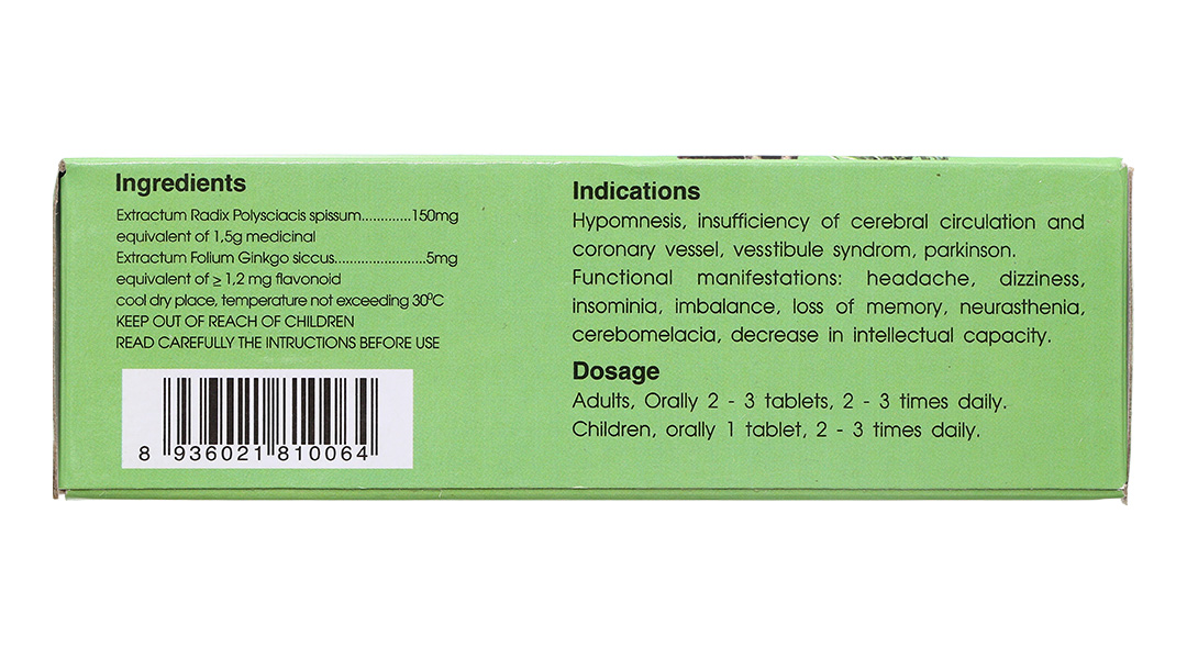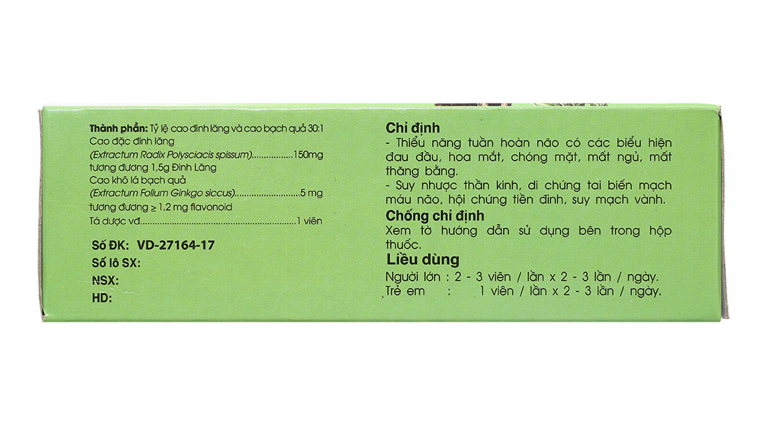 - Cao khô lá Bạch quả (Extractum Folium Ginkgo siccus) 5mg (tương đương flavonoid ≥ 1,2mg).