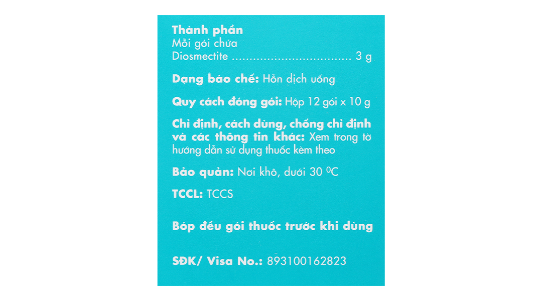 - Thành phần dược chất: Mỗi gói chứa Diosmectite 3g.
