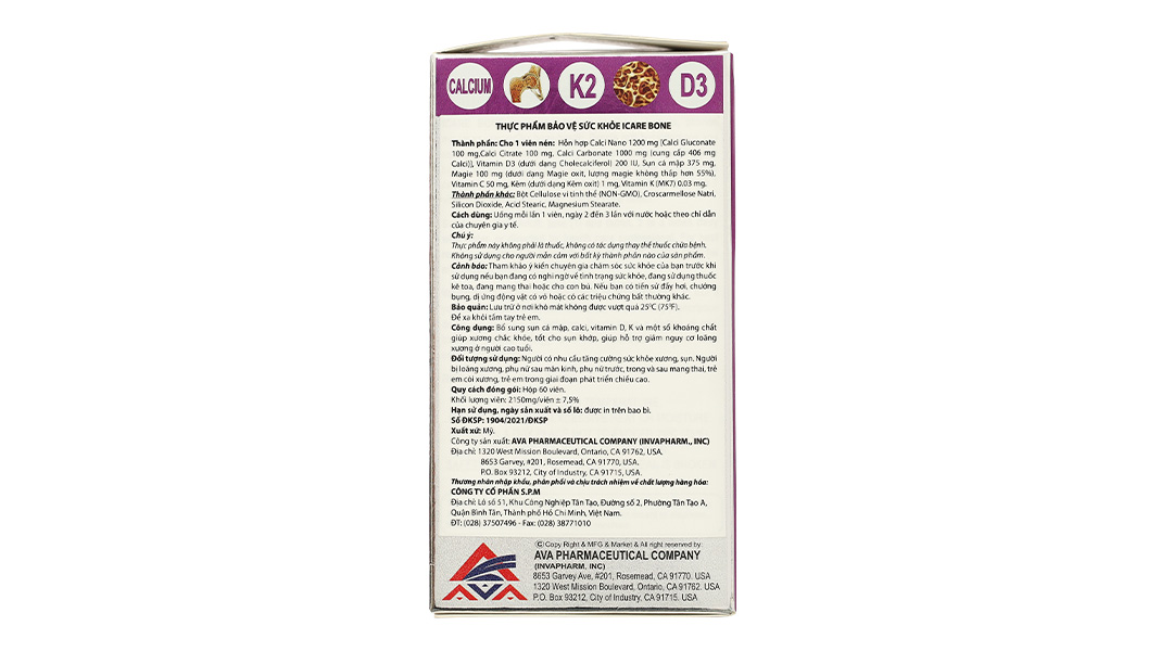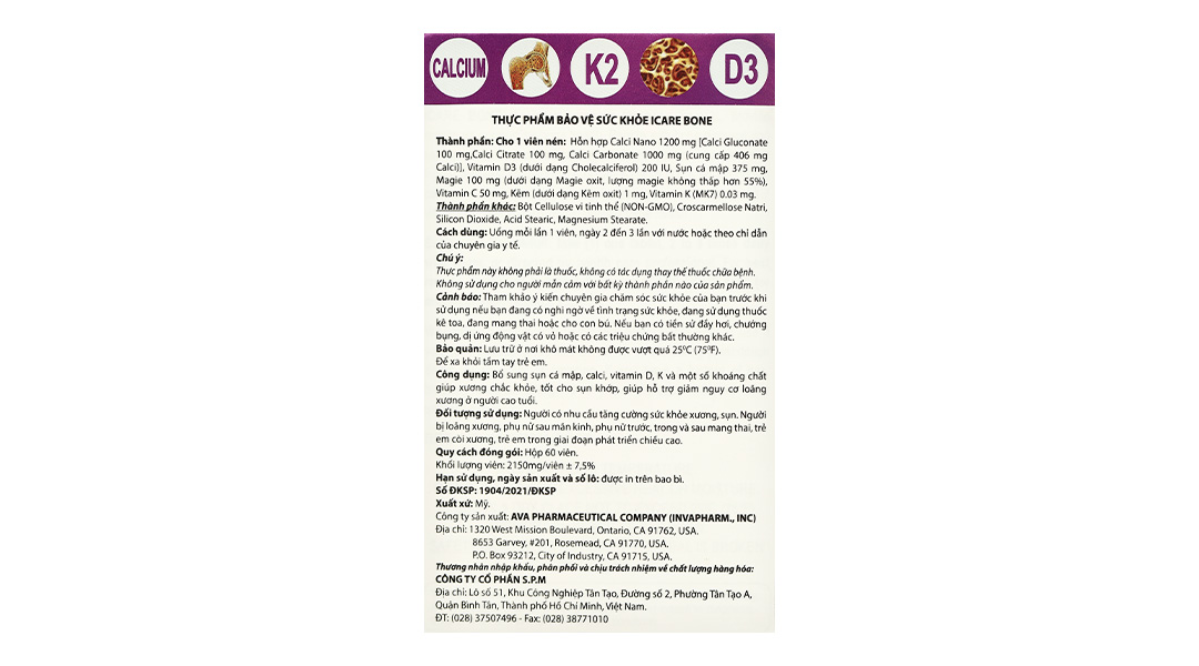 Thành phần chính của Icare Bone là hỗn hợp các loại Calci kết hợp cùng với sụn cá mập, vitamin D, K và các thành phần khác giúp cho xương chắc khỏe và phòng ngừa loãng xương. Hỗ trợ tăng tiết dịch khớp.