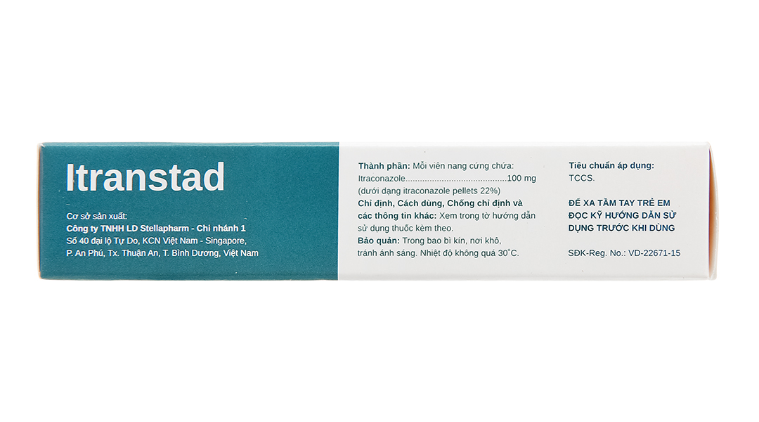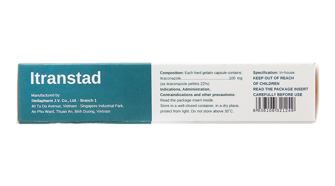 Bảo quản Itranstad 100mg trong bao bì kín, nơi khô, tránh ánh sáng. Nhiệt độ không quá 30°C.