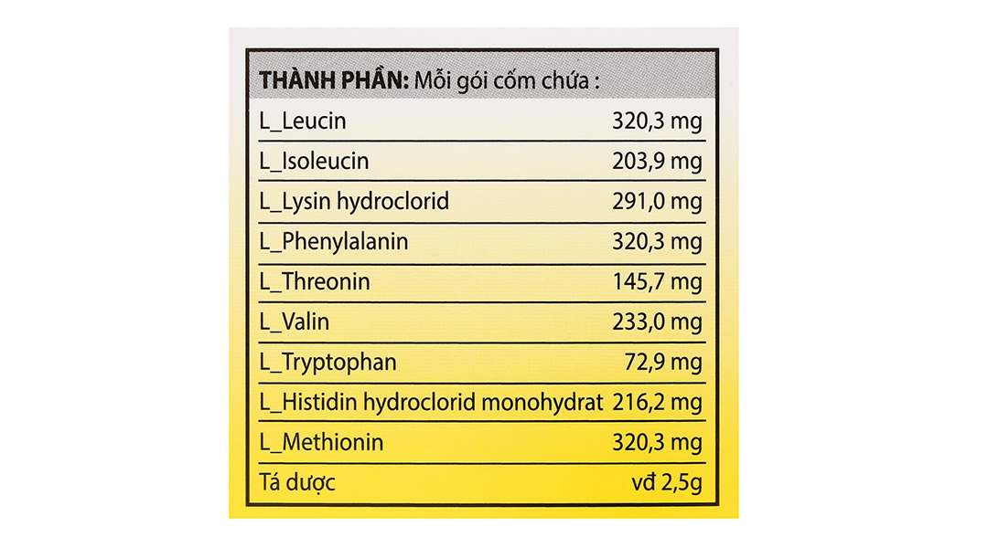 Lưu ý: Trong thành phần có một số acid amin và một loại tá dược ít tan trong nước. Vì vậy, khi pha sẽ còn có những tiểu phân chưa tan, bệnh nhân có thể lắc đều và uống hết hoặc thêm nước và khuấy khoảng 3-5 phút để tạo thành dung dịch tan hoàn toàn và uống hết.