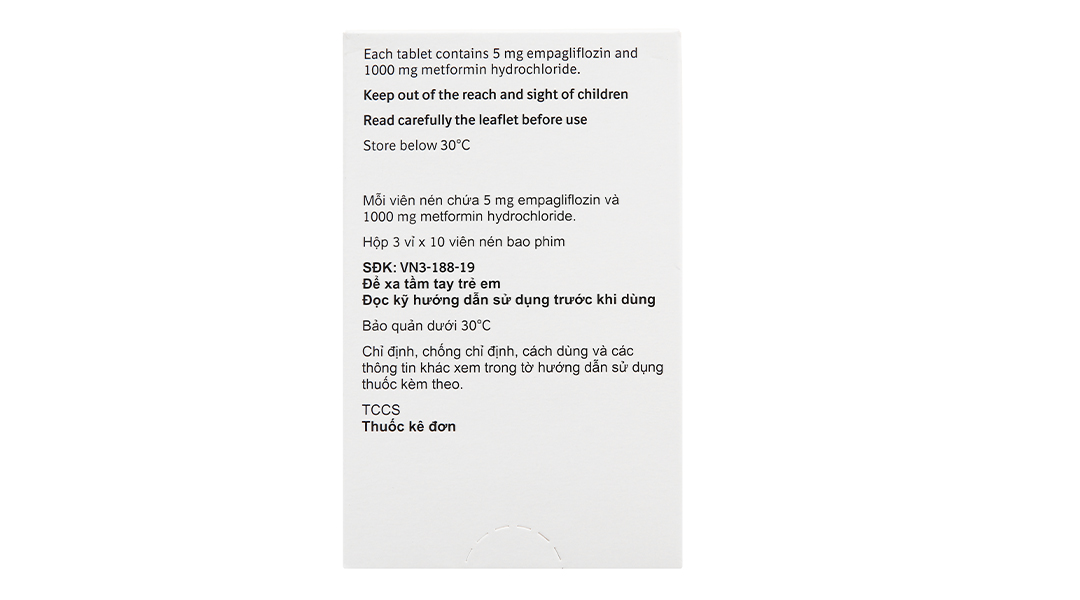 D-Glucitol, 1,5-anhydro-1-C-[4-chloro-3-[[4-[[(3S)-tetrahydro-3-furanyl]oxy]phenyl]methyl]phenyl]-, (1S) (= empagliflozin) 5mg hoặc 12,5 mg và N,N-dimethylimidodicarbonimidic diamide hydrochloride (= metformin hydrochloride) 1000 mg.