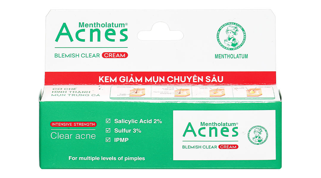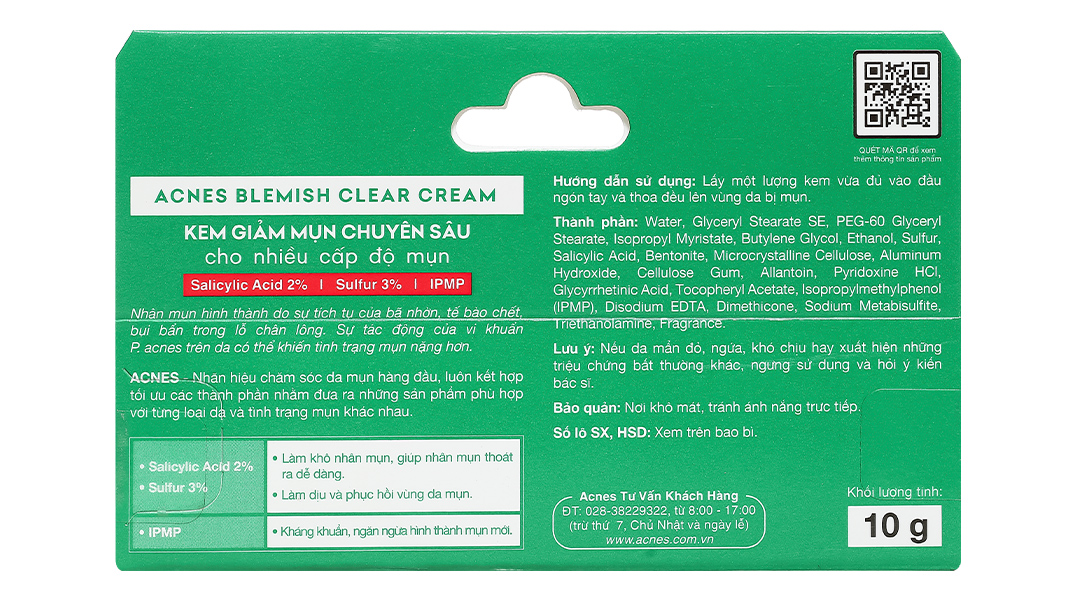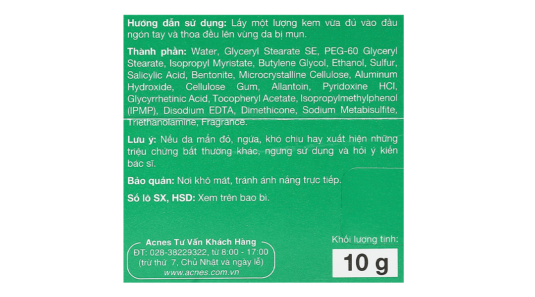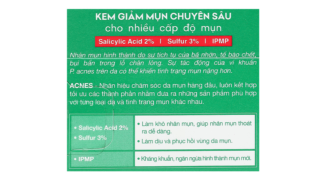 Thành phần chínhWater, Glyceryl Stearate SE, PEG-60 Glyceryl Stearate, Isopropyl Myristate, Butylene Glycol, Ethanol, Sulfur, Salicylic Acid, Bentonite, Microcrystalline Cellulose, Aluminum Hydroxide, Cellulose Gum, Allantoin, Pyridoxine HCl, Glycyrrhetinic Acid, Tocopheryl Acetate, Isopropylmethylphenol (IPMP), Disodium EDTA, Dimethicone, Sodium Metabisulfite, Triethanolamine, Fragrance.