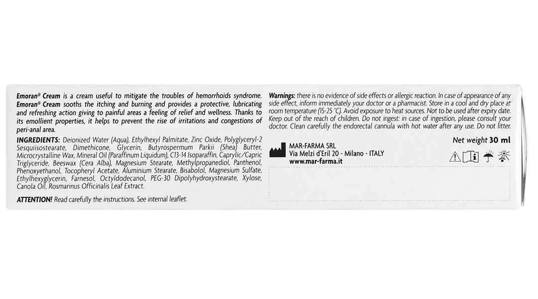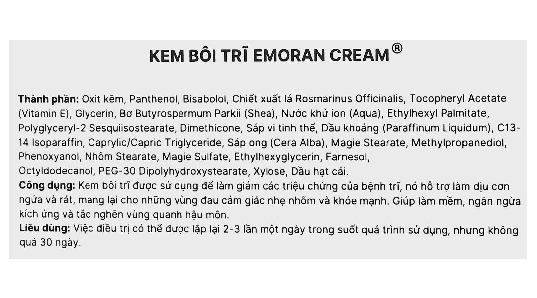 - Kem bôi Emoran được nghiên cứu và phát triển để giải quyết trực tiếp những vấn đề mà người bệnh trĩ gặp phải. Sản phẩm này giúp làm giảm ngay các triệu chứng ngứa ngáy, rát bỏng và đau đớn do bệnh trĩ gây ra. Thành phần như Bisabolol có tác dụng giảm viêm, làm dịu và bảo vệ vùng da bị tổn thương, giúp vùng hậu môn cảm thấy thoải mái và nhẹ nhõm hơn. Vitamin E và dầu hạt cải cung cấp độ ẩm và nuôi dưỡng làn da, giúp duy trì sự mềm mại, mịn màng và hạn chế tình trạng khô rát. Oxit kẽm, Panthenol, chiết xuất lá Rosmarinus Officinalis (Hương thảo) với khả năng chống viêm mạnh mẽ, các hoạt chất này giúp làm lành tổn thương, bảo vệ da khỏi sự kích ứng, đồng thời hỗ trợ phục hồi và tái tạo lớp da bị tổn thương tại vùng hậu môn.