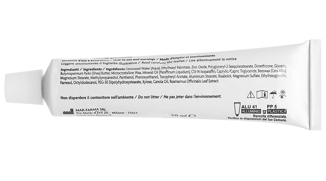 Oxit kẽm, Panthenol, Bisabolol, Chiết xuất lá Rosmarinus Officinalis, Tocopheryl Acetate (Vitamin E), Glycerin, Bơ Butyrospermum Parkii (Shea), Nước khử ion (Aqua), Ethylhexyl Palmitate, Polyglyceryl-2 Sesquiisostearate, Dimethicone, Sáp vi tinh thể, Dầu khoáng (Paraffinum Liquidum), C13- 14 Isoparaffin, Caprylic/Capric Triglyceride, Sáp ong (Cera Alba), Magie Stearate, Methylpropanediol, Phenoxyanol, Nhôm Stearate, Magie Sulfate, Ethylhexyglycerin, Farnesol, Octyldodecanol, PEG-30 Dipolyhydroxystearate, Xylose, Dầu hạt cải.