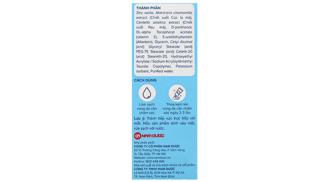 Zinc oxide, Matricaria chamomilla extract (Chiết xuất Cúc la mã), Centella asiatica extract (Chiết xuất Rau má), D-panthenol, DL-alpha Tocopheryl acetate (vitamin E), 5-ureidohydantoin (Allantoin), Glycerin, Cetyl Alcohol (and) Glyceryl Stearate (and) PEG-75 Stearate (and) Ceteth-20 (and) Steareth-20, Hydroxyethyl Acrylate/Sodium Acryloyldimethyl Taurate Copolymer, Potassium sorbate, Purified water.