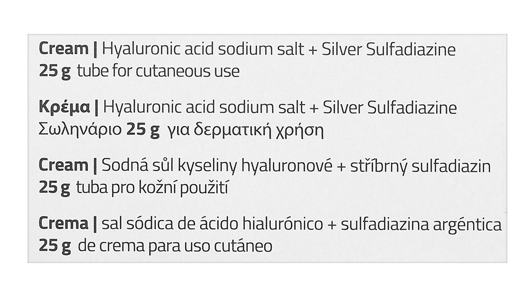 Thành phầnThành phần chính: Muối natri của axit hyaluronic 0,2%. Các thành phần khác: Bạc Sulfadiazine 1%, Polyethylene glycol 400 monostearate, Decyl este của axit oleic, Sáp nhũ hóa, Glycerol, Dung dịch Sorbitol 70%, Nước tinh khiết.