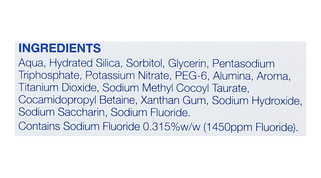 - Aqua, Hydrated Silica, Sorbitol, Glycerin, Pentasodium Triphosphate, Potassium Nitrate, PEG-6, Alumina, Aroma, Titanium Dioxide, Sodium Methyl Cocoyl Taurate, Cocamidopropyl Betaine, Xanthan Gum, Sodium Hydroxide, Sodium Saccharin, Sodium Fluoride.