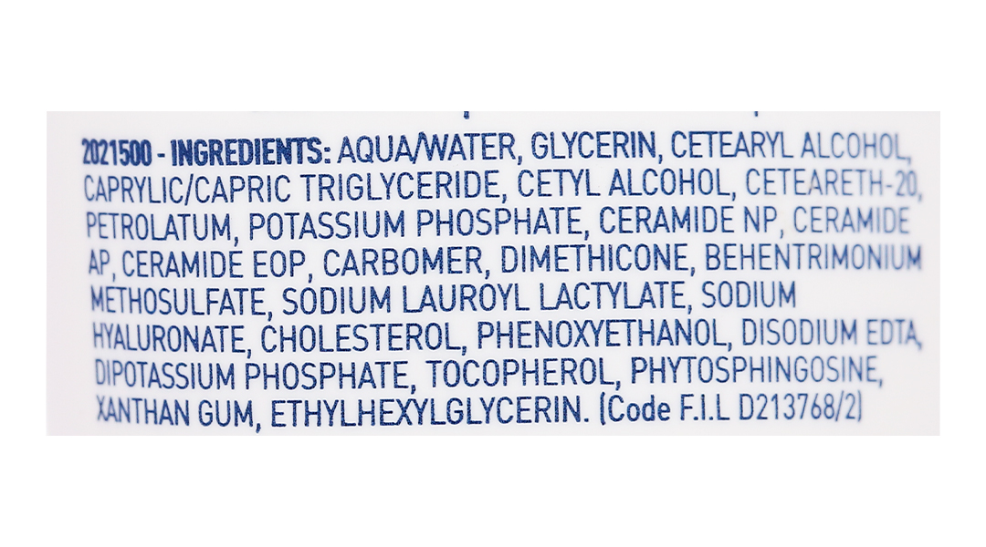 Aqua/Water, Glycerin, Cetearyl Alcohol, Caprylic/Capric Triglyceride, Cetyl Alcohol, Ceteareth-20, Petrolatum, Potassium Phosphate, Ceramide NP, Ceramide AP, Ceramide EOP, Carbomer, Dimethicone, Behentrimonium Methosulfate, Sodium Lauroyl Lactylate, Sodium Hyaluronate, Cholesterol, Phenoxyethanol, Disodium Edta, Dipotassium Phosphate, Tocopherol, Phytosphingosine, Xanthan Gum, Ethylhexylglycerin.