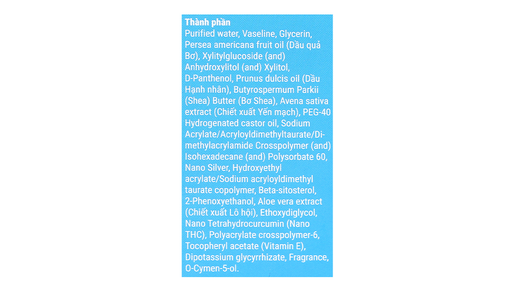 Purified water, Vaseline, Glycerin, Persea americana fruit oil (Dầu quả Bơ), Xylitylglucoside (and) Anhydroxylitol (and) Xylitol, D-Panthenol, Prunus dulcis oil (Dầu Hạnh nhân), Butyrospermum Parkii (Shea) Butter (Bơ Shea), Avena sativa extract (Chiết xuất Yến mạch), PEG-40 Hydrogenated castor oil, Sodium Acrylate/ Acryloyldimethyltaurate/Di-methylacrylamide Crosspolymer (and) Isohexadecane (and) Polysorbate 60, Nano Silver, Hydroxyethyl acrylate/Sodium acryloyldimethyl taurate copolymer, Beta-sitosterol, 2-Phenoxyethanol, Aloe vera extract (Chiết xuất Lô hội), Ethoxydiglycol, Nano Tetrahydrocurcumin (Nano THC), Polyacrylate crosspolymer-6, Tocopheryl acetate (Vitamin E), Dipotassium glycyrrhizate, Fragrance, O-Cymen-5-ol.