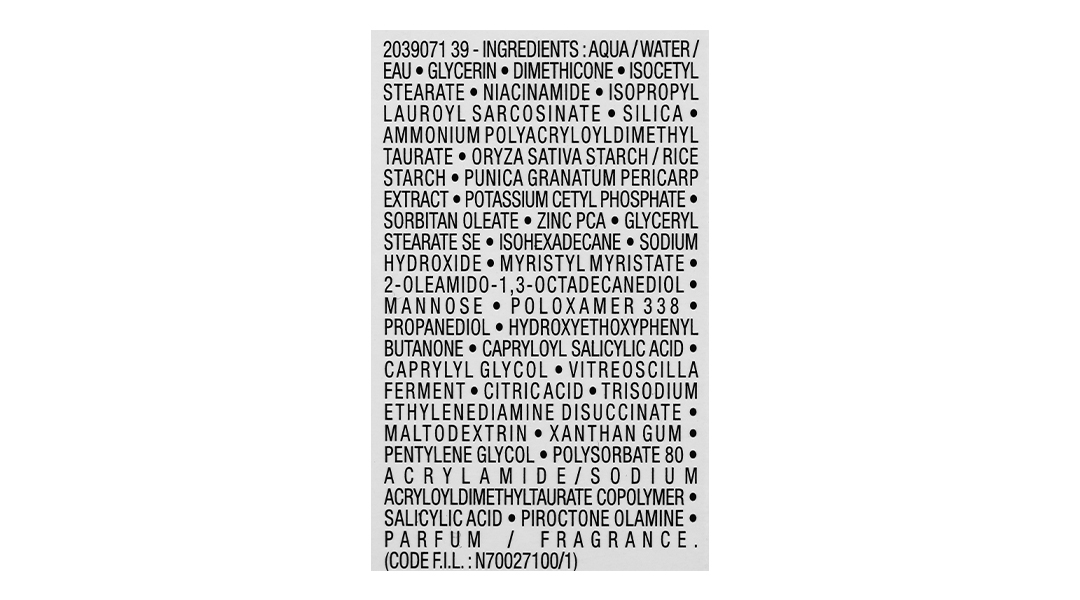 Thành phần chínhAqua/Water/Eau, Glycerin, Dimethicone, Isocetyl Stearate, Niacinamide, Isopropyl Lauroyl Sarcosinate, Silica, Ammonium Polyacryloyldimethyl Taurate, Oryza Sativa Starch/Rice Starch, Punica Granatum Pericarp Extract, Potassium Cetyl Phosphate, Sorbitan Oleate, Zinc Pca, Glyceryl Stearate Se, Isohexadecane, Sodium Hydroxide, Myristyl Myristate, 2-Oleamido-1,3-Octadecanediol, Mannose, Poloxamer 338, Propanediol, Hydroxyethoxyphenyl Butanone, Capryloyl Salicylic Acid, Caprylyl Glycol, Vitreoscilla Ferment, Citric Acid, Trisodium Ethylenediamine Disuccinate, Maltodextrin, Xanthan Gum, Pentylene Glycol, Polysorbate 80, Acrylamide/Sodium Acryloyldimethyltaurate Copolymer, Salicylic Acid, Piroctone Olamine, Parfum/Fragrance.