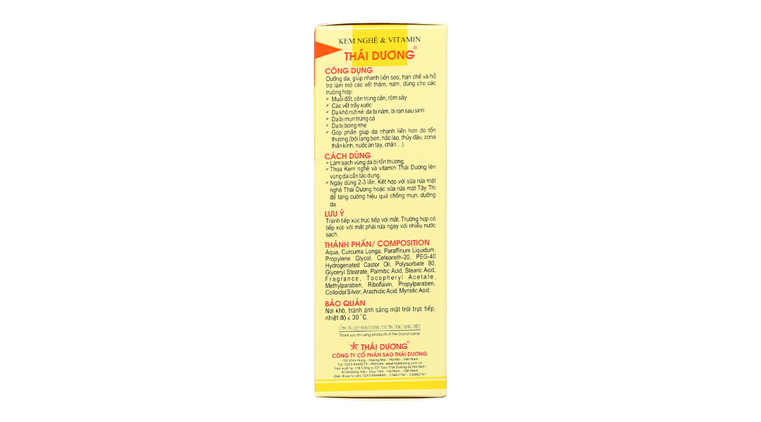 Curcuma longa (Nghệ), Aqua, Paraffin oil, Cetearet 20, PEG – 40 hydrogenated castor oil, Polysorbate 80, Mono propylene glycol, Glyceryl monostearate, stearic acid, Fragrance, Tocopheryl acetate (Vitamin E), Riboflavin (Vitamin B2), Nano silver (Nano bạc), Methyl paraben, Propyl paraben.