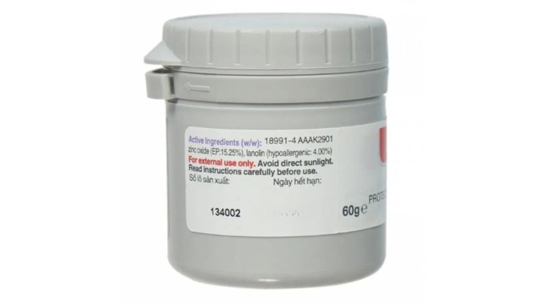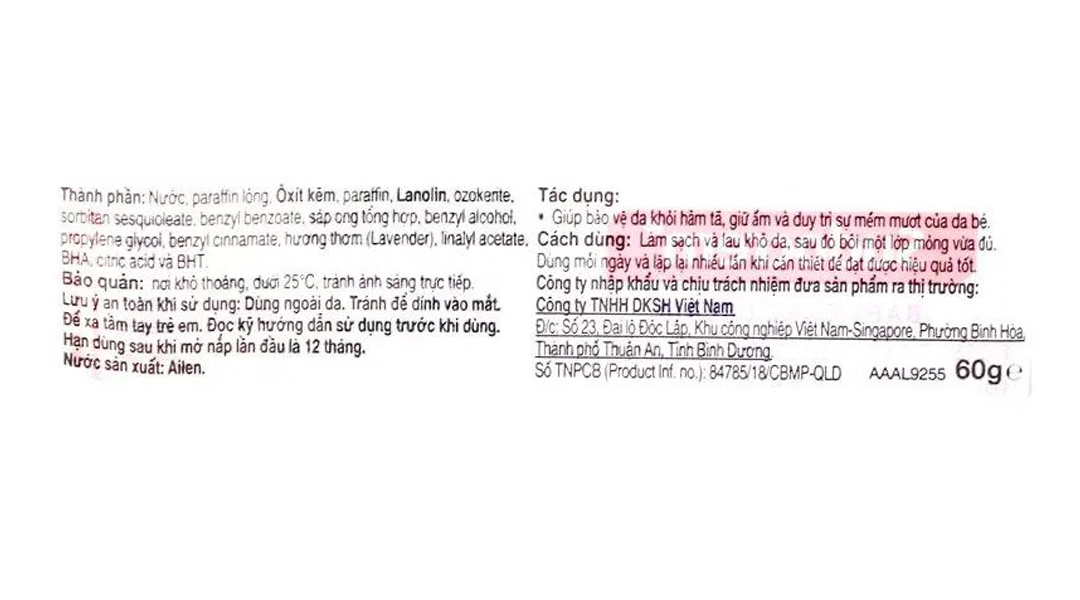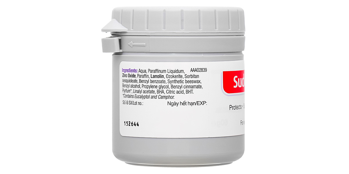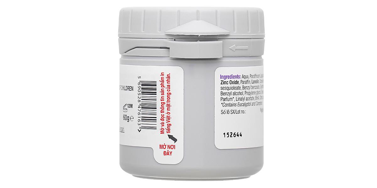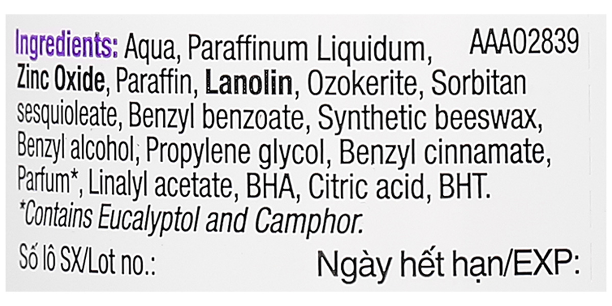 Aqua, Paraffinum Liquidum, Zinc Oxide, Paraffin, Lanolin, Ozokerite, Sorbitan sesquioleate, Benzyl benzoate, Synthetic beeswax, Benzyl alcohol, Propylene glycol, Benzyl cinnamate, Parfum*, Linalyl acetate, BHA, Citric acid, BHT, Eucalyptol và Camphor.