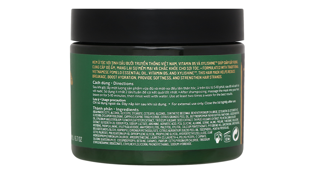Thành phần chi tiết: Aqua/Water, Cetyl Alcohol, Glyceryl Stearate, Cetearyl Alcohol, Synthetic Beeswax, Behentrimonium chloride, Ceteareth-20, Ceteareth-12 Glycerin, Cyclopentasiloxane, Caprylic/Capric Triglyceride, Citrus Grandis Peel Oil, Butyrospermum Parkii Butter, Panthenol, Cocos Nucifera Oil, Epilobium Angustifolium Flower/Leaf/Stem Extract, Triticum Vulgare Seed Extract, Thymus Vulgaris Extract, Pelvetia Canaliculata Extract, Glycereth-26, Sodium PCA, Sodium Lactate, Arginine, Aspartic Acid, PCA, Glycine, Alanine, Serine, Valine, Proline, Threonine, Isoleucine, Histidine, Phenylalanine, Xylitylglucoside, Anhydroxylitol, Maltitol Xylitol, Calcium Pantothenate, Pyridoxal HCl, Dimethicone, Dimethiconol Bis-(Isostearoyl/Oleoyl Isopropyl) Dimonium Methosulfate, Citrus Aurantium Dulcis Peel Oil, Tocopherol, Mentha Piperita Oil, Cetyl Palmitate, Polyquaternium-10, Dipropylene Glycol, Propylene Glycol, Hydroxyethylcellulose, Guar Hydroxypropyltrimonium Chloride, Amodimethicone, Laureth-23, Laureth-4 polyglyceryl-3 Caprate, Silicone Quaternium-22, Cocamidopropyl Betaine, Caramel, Parfum, Cetylpyridinium Chloride, Trisodium Ethylenediamine Disuccinate, Ethylhexylglycerin, Phenoxyethanol, Sodiumhydroxide.