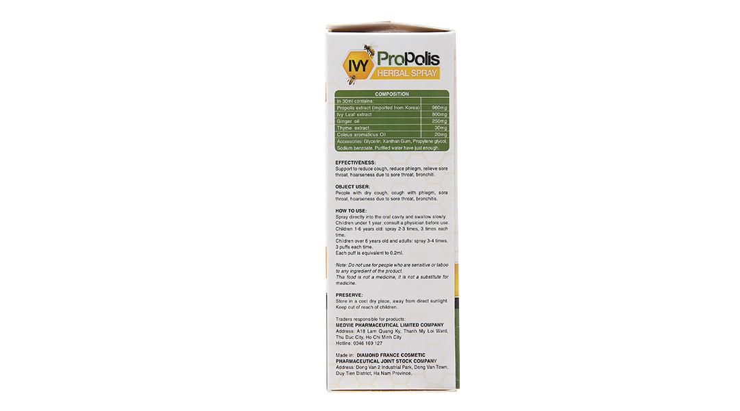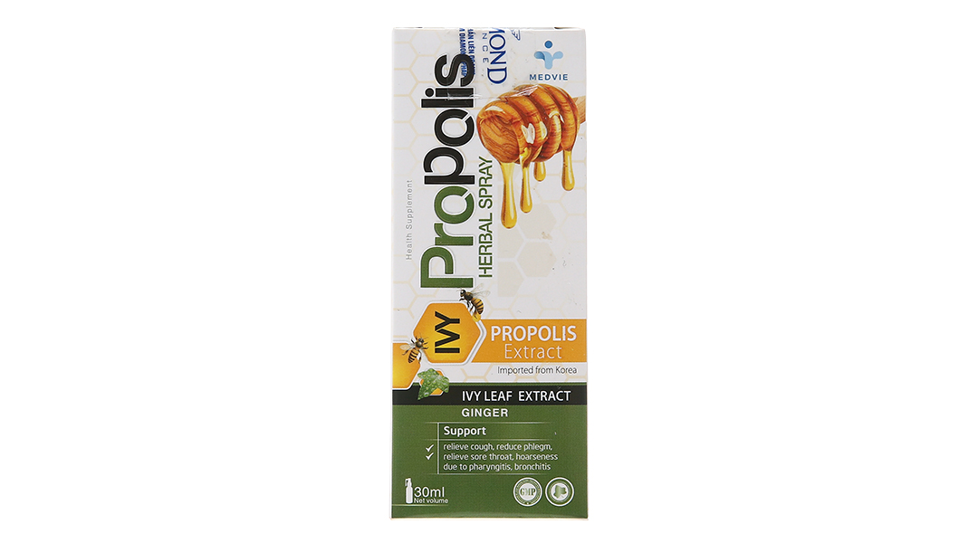Xịt họng keo ong Ivy Propolis hỗ trợ giảm ho, giảm đờm, giảm đau rát họng, khản tiếng do viêm họng, viêm phế quản.