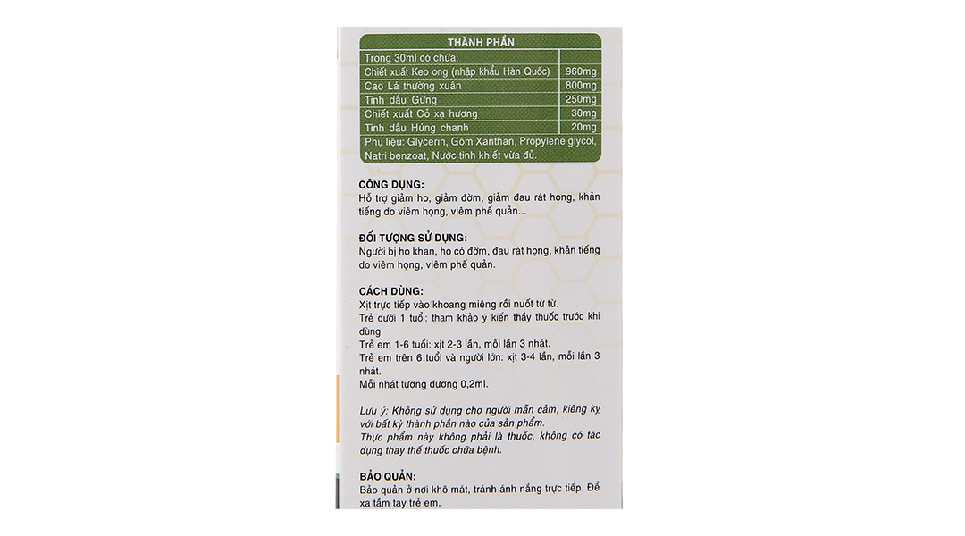 Trong 30ml có chứa: Chiết xuất Keo ong (nhập khẩu Hàn Quốc) 960mg, Cao Lá thường xuân 800mg, Tinh dầu Gừng 250mg, Chiết xuất Cỏ xạ hương 30mg, Tinh dầu Húng chanh 20mg