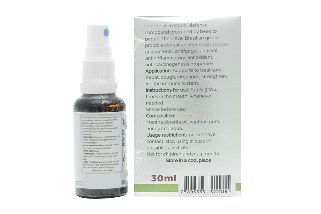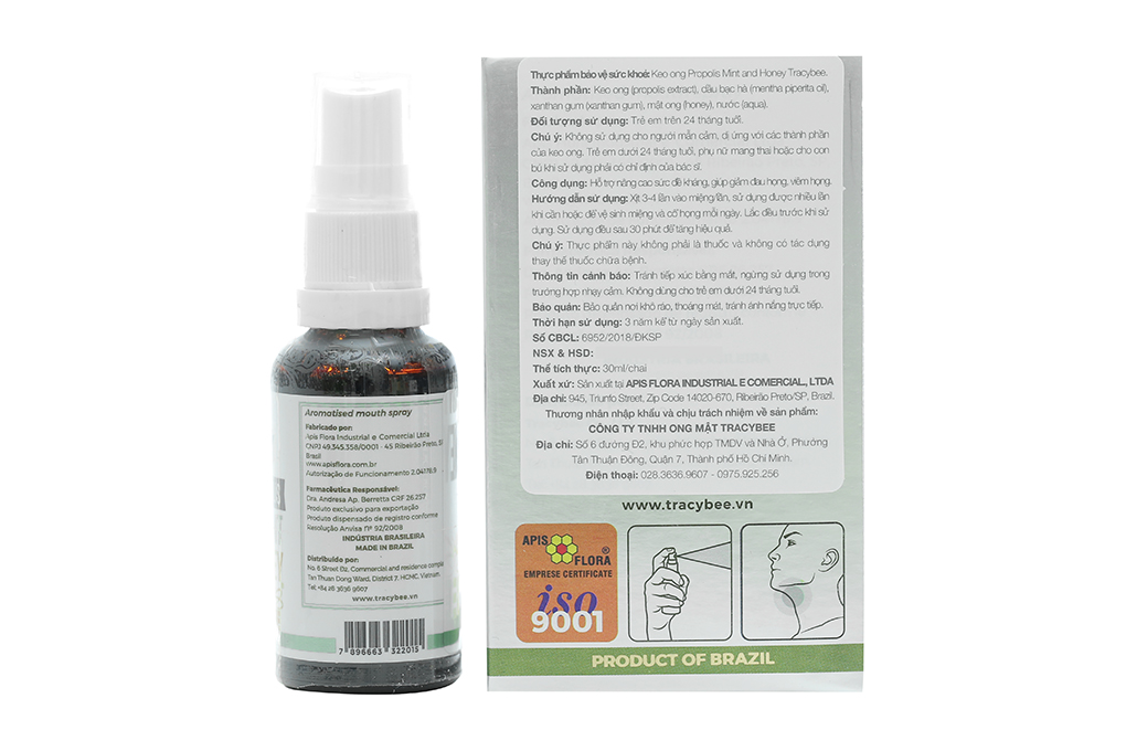 - Xịt họng keo ong Propolis Mint and Honey Tracybee là sản phẩm chăm sóc sức khỏe đường hô hấp được chiết xuất từ keo ong xanh Brazil – một trong những loại keo ong có giá trị y học cao trên thế giới. Sản phẩm kết hợp các thành phần thiên nhiên như mật ong, dầu bạc hà, và vị bạc hà the mát, mang lại công dụng giảm đau họng, viêm họng và tăng cường sức đề kháng một cách hiệu quả.
