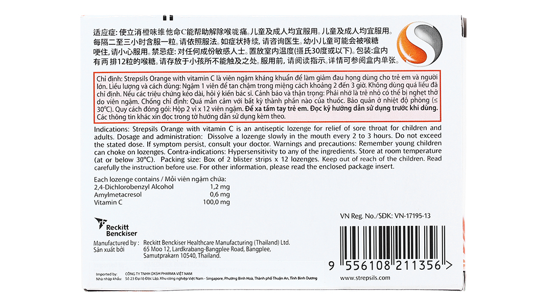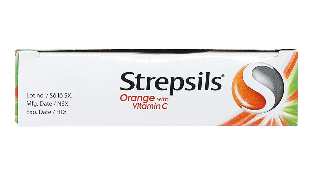 Strepsils Orange chứa hai hoạt chất 2,4-Dichlorobenzyl Alcohol và Amylmietacresol có tính kháng khuẩn sử dụng trong điều trị viêm họng. Viên ngậm Strepsils là viên ngậm kháng khuẩn để làm giảm đau họng dùng cho trẻ em và người lớn.