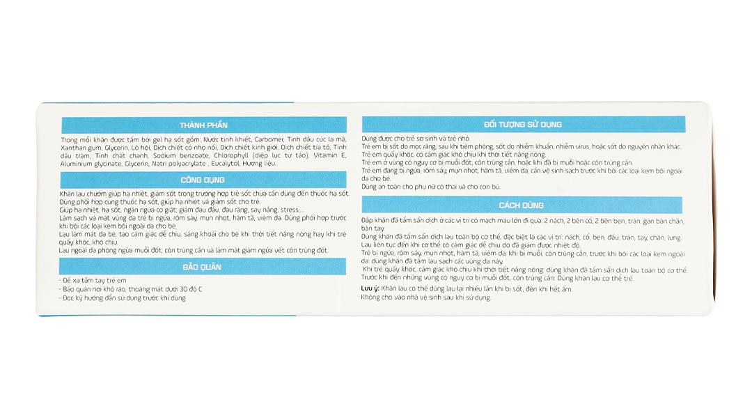 Trong mỗi khăn được tẩm bởi gel hạ sốt gồm: Nước tinh khiết, Carbomer, Tinh dầu cúc la mã, Xanthan gum, Glycerin, Lô hội, Dịch chiết cỏ nhọ nồi, Dịch chiết kinh giới, Dịch chiết tía tô, Tinh dầu tràm, Tinh chất chanh, Sodium benzoate, Chlorophyll (diệp lục từ tảo), Vitamin E, Aluminium glycinate, Glycerin, Natri polyacrylate, Eucalyptol, Hương liệu.