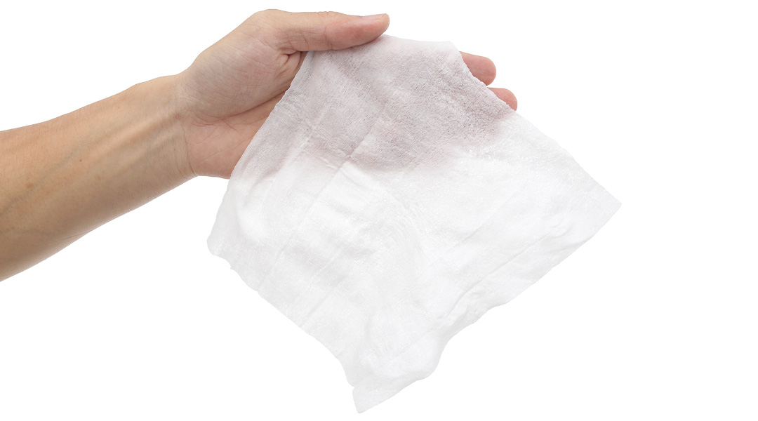 Lấy khăn ra khỏi bao giấy. Dùng khăn lau nhẹ vùng kín từ trước ra sau và 2 bên, không cần rửa lại với nước.