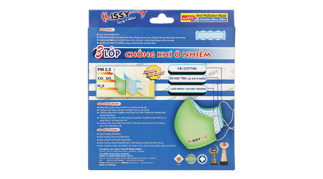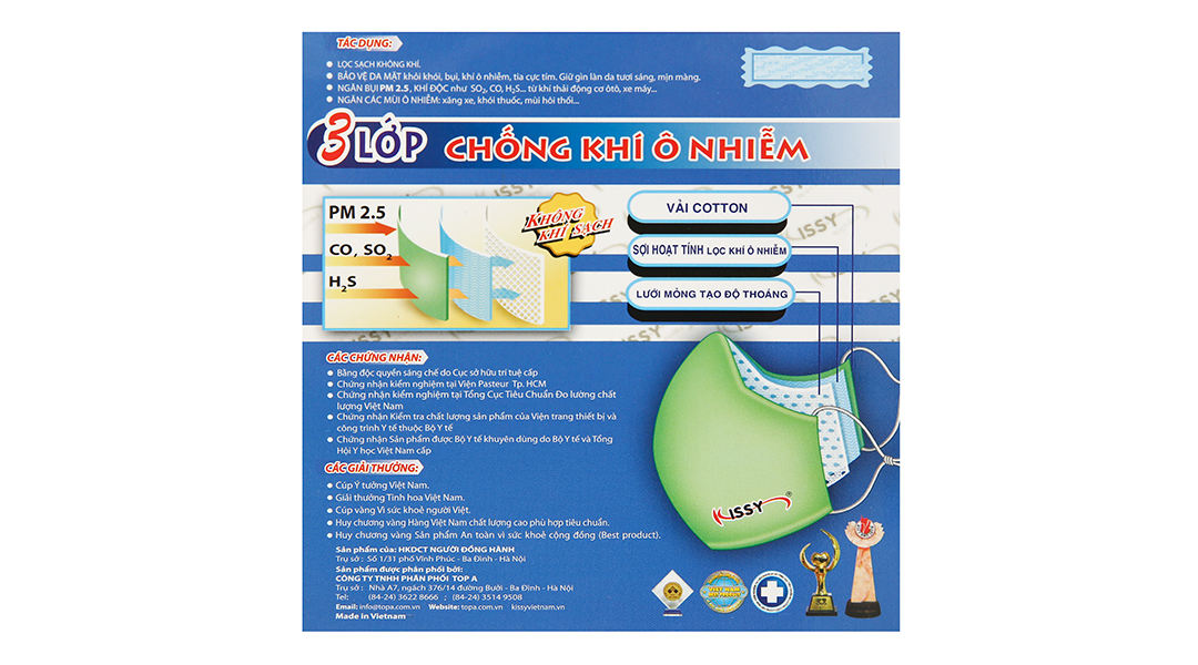 Cấu trúc 3 lớp: Ngoài cùng là vải cotton, lớp giữa là sợi hoạt tính có tác dụng lọc khí, lớp trong cùng là lưới mỏng có tác dụng tạo độ thoáng khí.