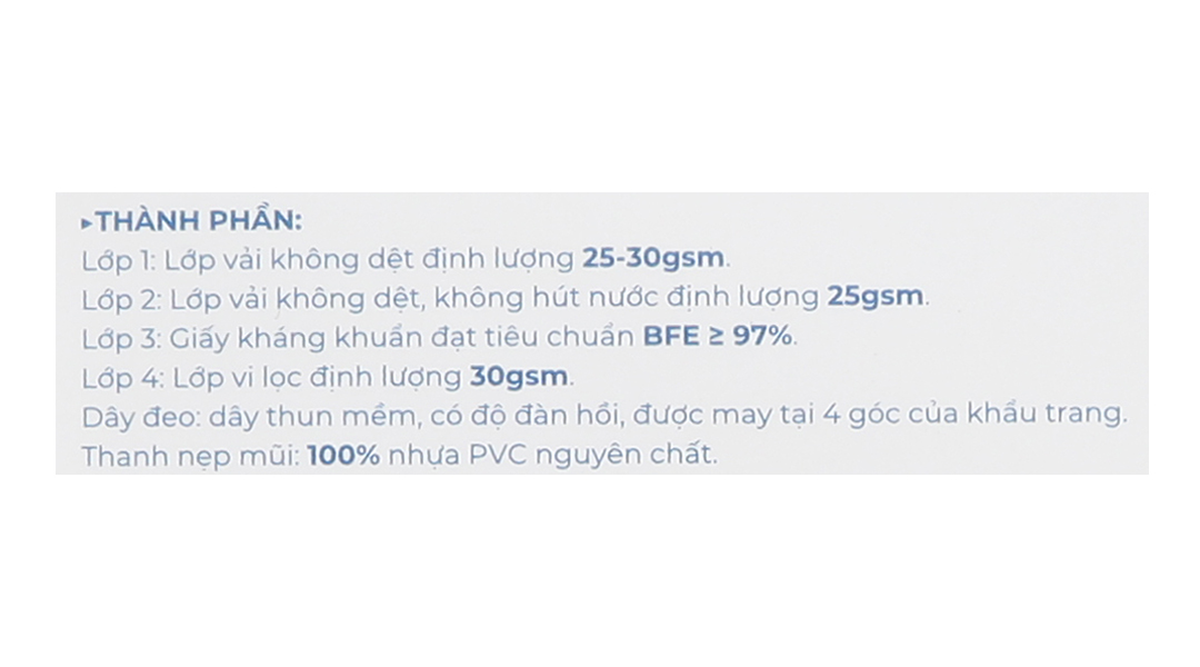 Thành phầnLớp vải không dệt định lượng 25 - 30gsm, Lớp vải không dệt, không hút nước định lượng 25gsm, Giấy kháng khuẩn đạt tiêu chuẩn BFE ≥ 97%, Lớp vi lọc định lượng 30gsm, Dây đeo, Thanh nẹp mũi