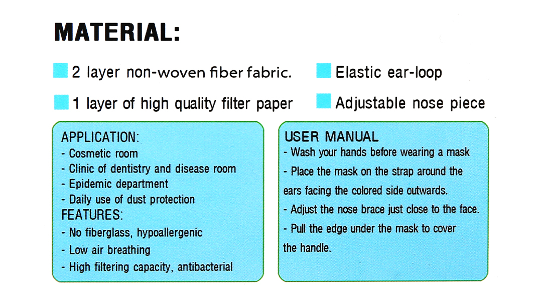 Thành phầnGồm 2 lớp vải không dệt, 1 lớp giấy lọc chất lượng cao, thun đeo tai, thanh chắn mũi