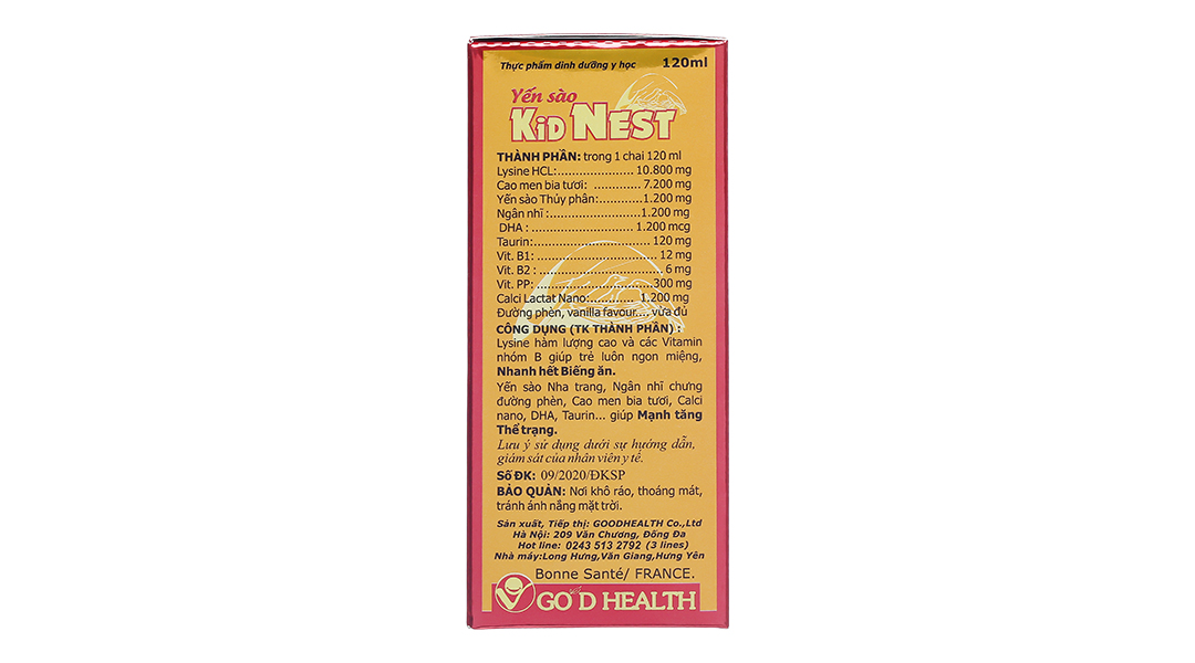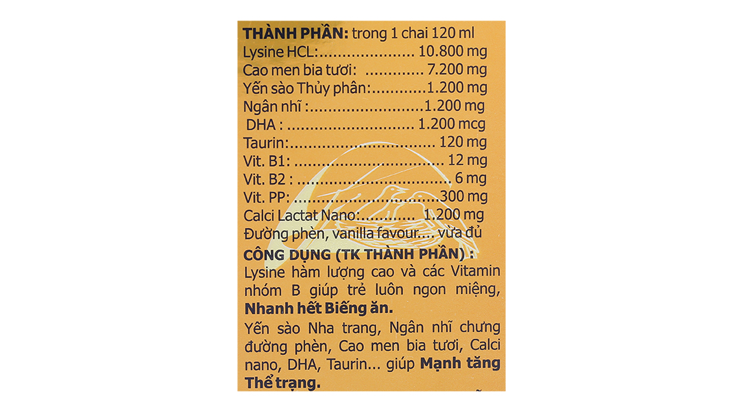 Thành phầnCao men bia tươi, Yến sào thuỷ phân, Ngân nhĩ, Lysine HCl, DHA, Taurin, Vitamin B1, Vitamin B2, Vitamin PP, Calci Lactat Nano, đường phèn, vanilla favour vừa đủ