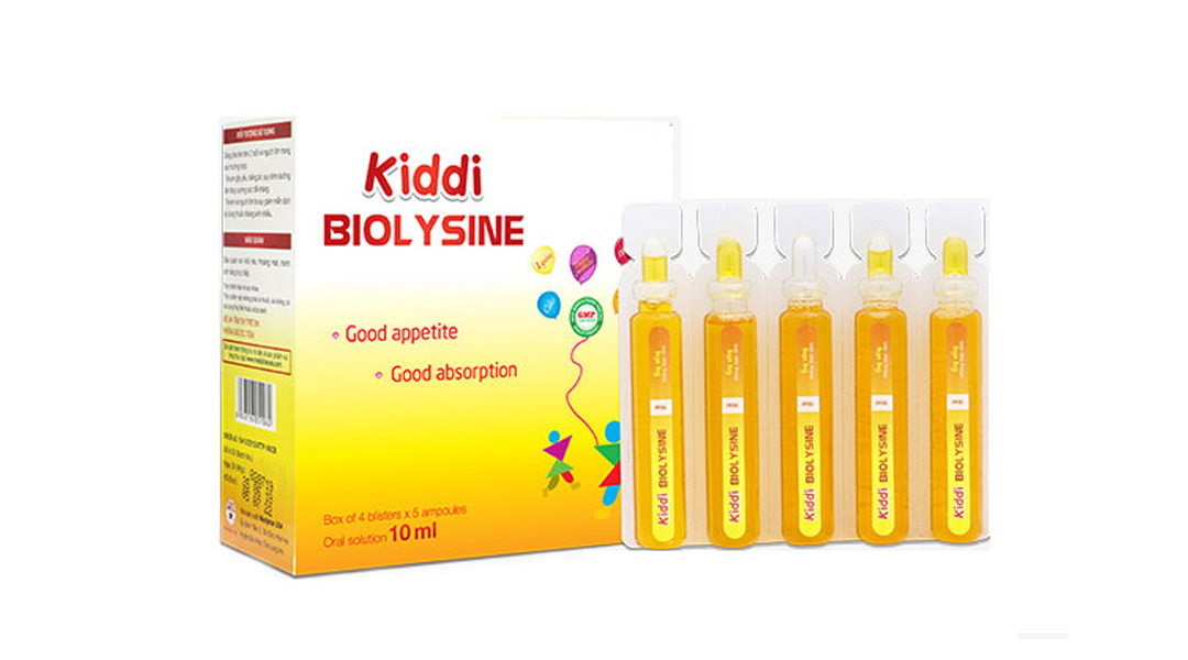 - Dung dịch Kiddi Biolysine hộp 20 ống x 10ml có thành phần bao gồm Lysine, các vitamin nhóm B, khoáng chất và các dưỡng chất giúp kích thích trẻ ăn ngon miệng hơn, hấp thu dinh dưỡng tốt hơn. Sản phẩm còn chứa thymomodulin, kẽm giúp tăng cường sức đề kháng cho trẻ.