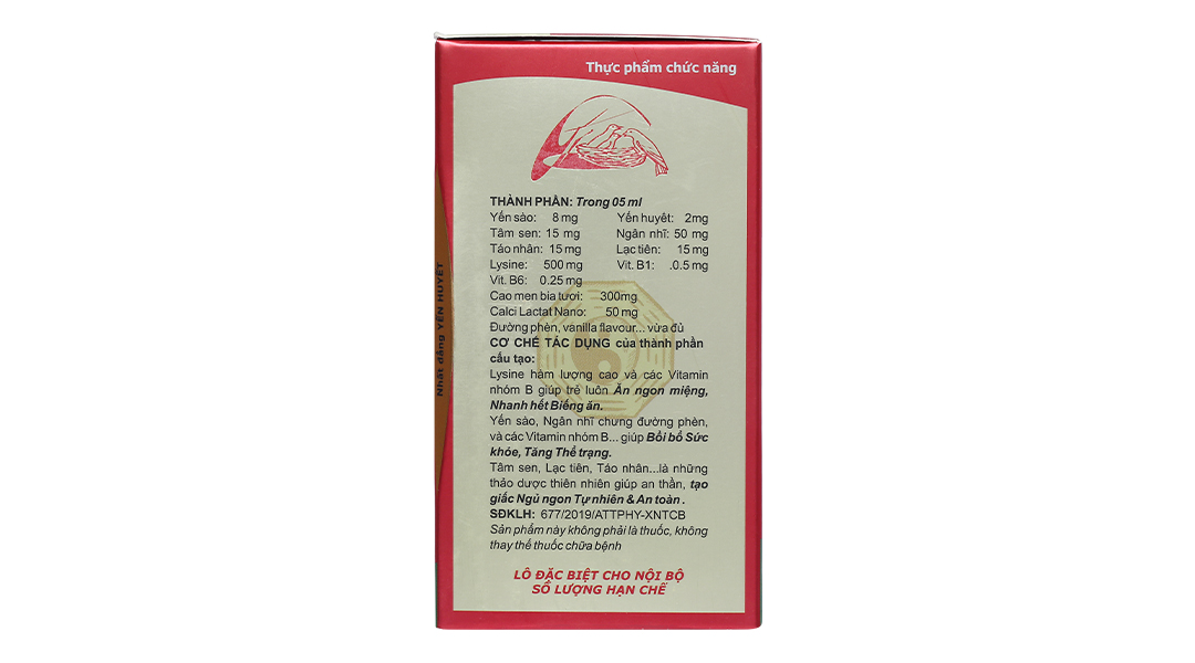 Thành phầnYến sào 8mg, Yến huyết 2mg, Tâm sen, Ngân nhĩ, Táo nhân, Lạc tiên, Lysine, Vitamin B1, Vitamin B6, Cao men bia tươi, Calci Lactat Nano, Đường phèn,...