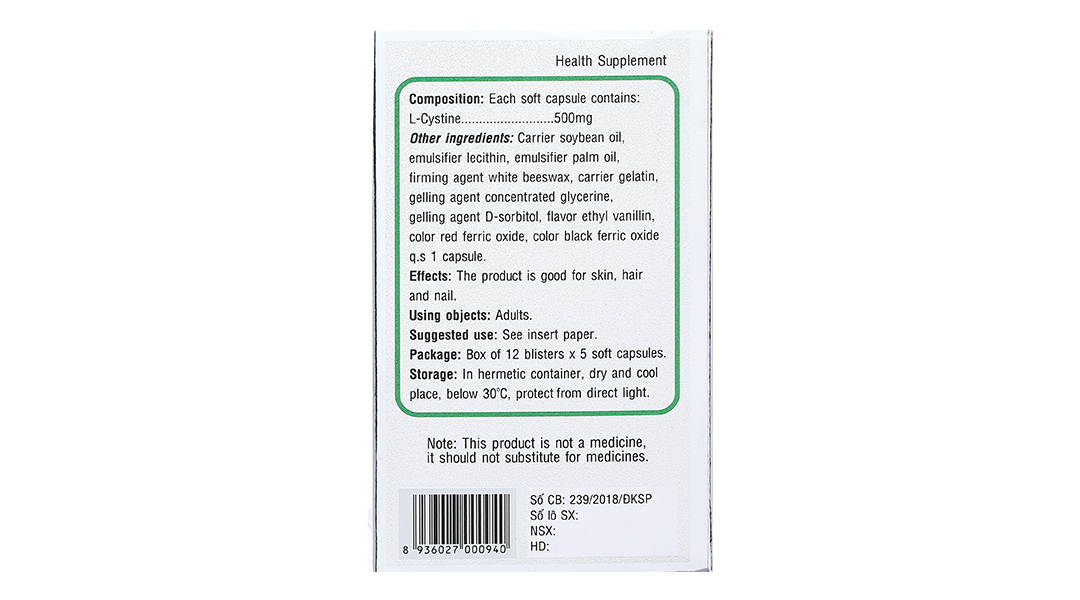 Mỗi viên nang mềm chứa: L-Cystine 500mg.