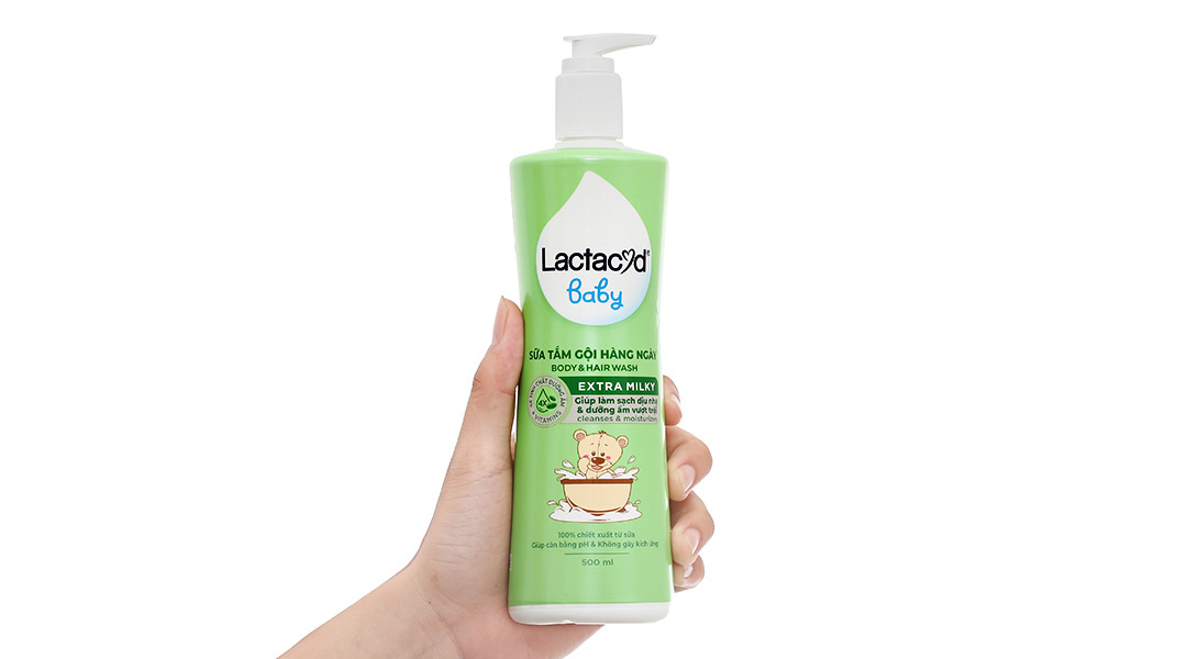 Cho một ít sữa tắm Lactacyd cho bé ra bông tắm hay lòng bàn tay rồi thoa nhẹ toàn thân bé. Tắm lại bằng nước sạch.