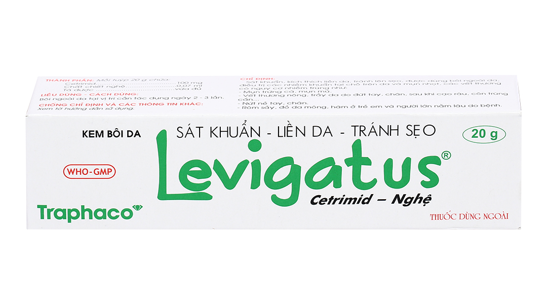 – LEVIGATUS là sự kết hợp giữa CETRIMID – TINH CHẤT NGHỆ có tác dụng sát khuẩn, kích thích liền da nhanh, tránh lên sẹo.