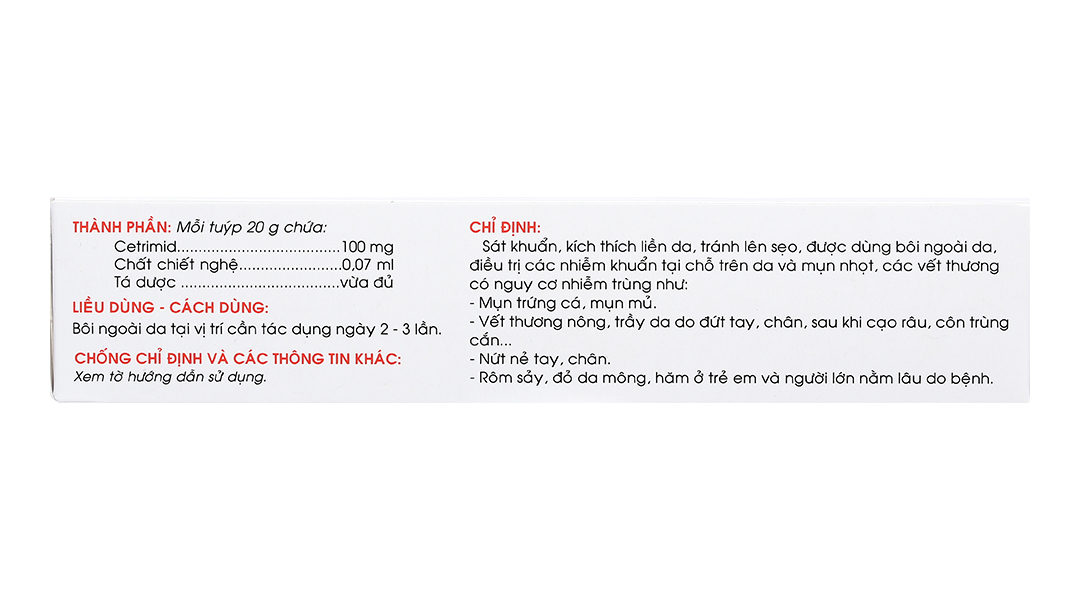 Hoạt chất: Cetrimid 100mg, Tinh chất nghệ 0.07ml.