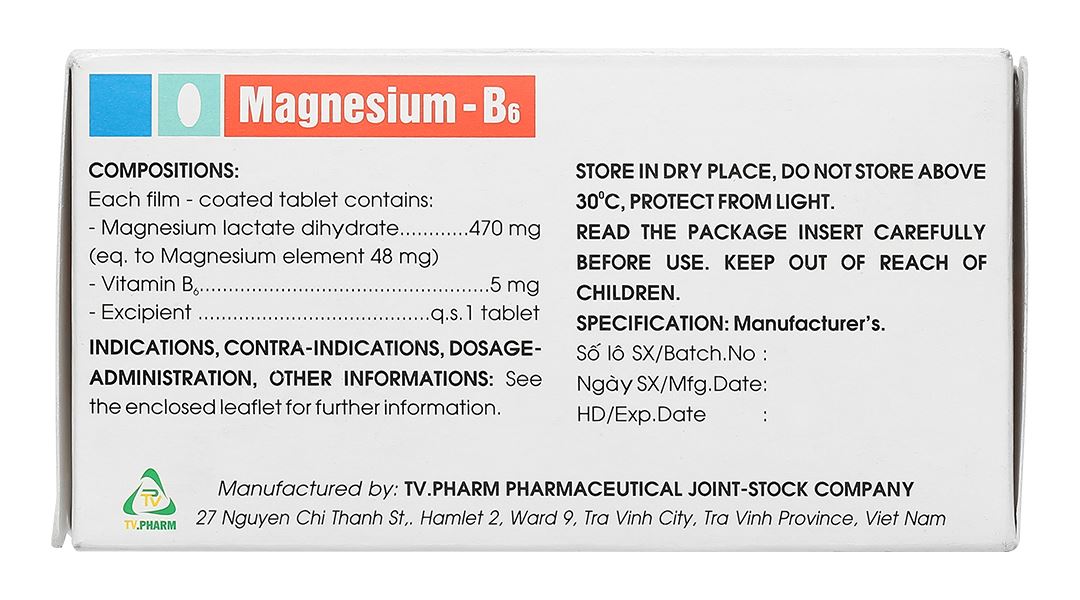 - Magnesi lactat dihydrat 470 mg (tương đương 48 mg magnesi nguyên tố).