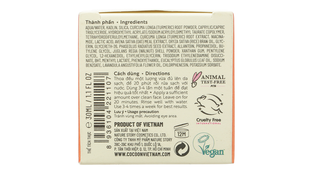 Mặt nạ Cocoon không chứa cồn, không sulfate, không dầu khoáng, không paraben.