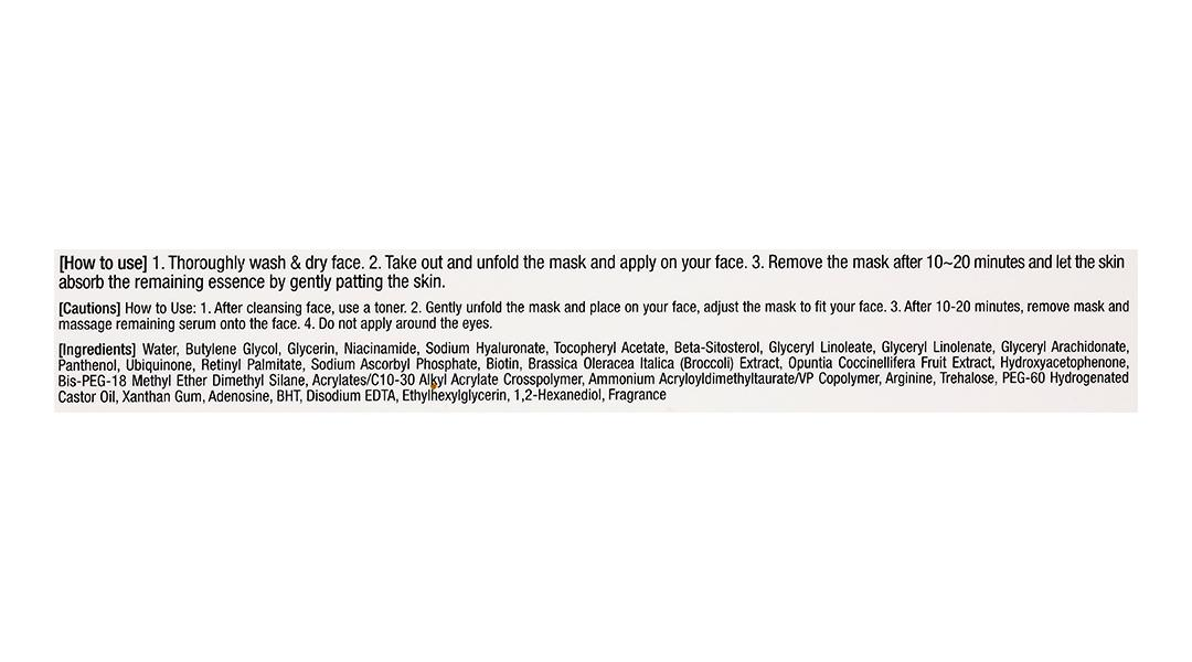 Water, Butylene Glycol, Glycerin, Niacinamide, Sodium Hyaluronate, Tocopheryl Acetate, Beta-Sitosterol, Glyceryl Linoleate, Glyceryl Linolenate, Glyceryl Arachidonate, Panthenol, Ubiquinone, Retinyl Palmitate, Sodium Ascorbyl Phosphate, Biotin, Brassica Oleracea Italica (Broccoli) Extract, Opuntia Coccinellifera Fruit Extract, Hydroxyacetophenone, Bis-PEG-18 Methyl Ether Dimethyl Silane, Acrylates/C10-30 Alkyl Acrylate Crosspolymer, Ammonium Acryloyldimethyltaurate/VP Copolymer, Arginine, Trehalose, PEG-60 Hydrogenated Castor Oil, Xanthan Gum, Adenosine, BHT, Disodium EDTA, Ethylhexylglycerin, 1,2-Hexanediol, Fragrance